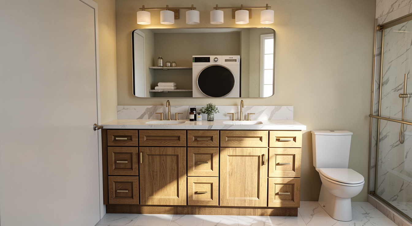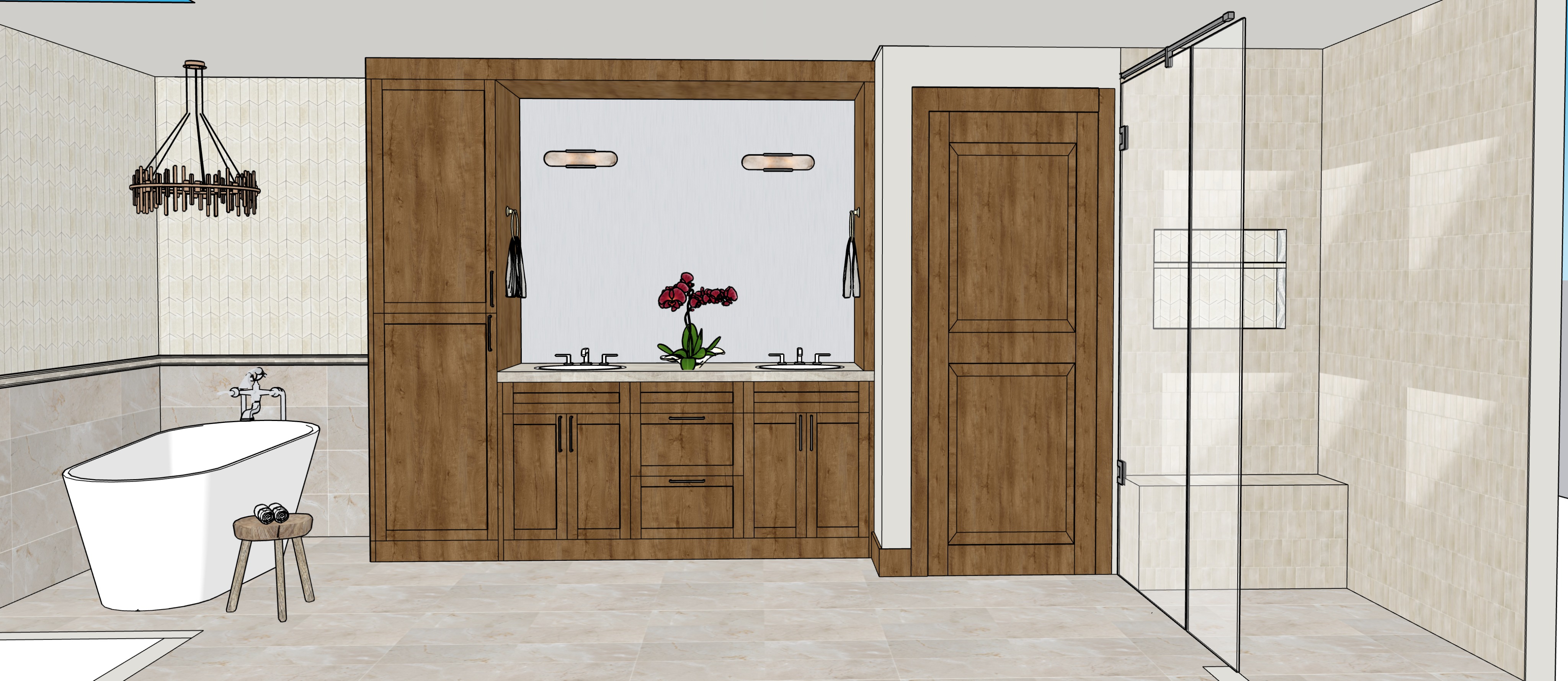 keep everything you see dont change anything make it realistic inset in the vanity is a mirror make the shower have 6x24 limestone tile on a brick lay pattern the mirrors reflection is the same door and walls the door is centered and there are towel bars on either side of the door