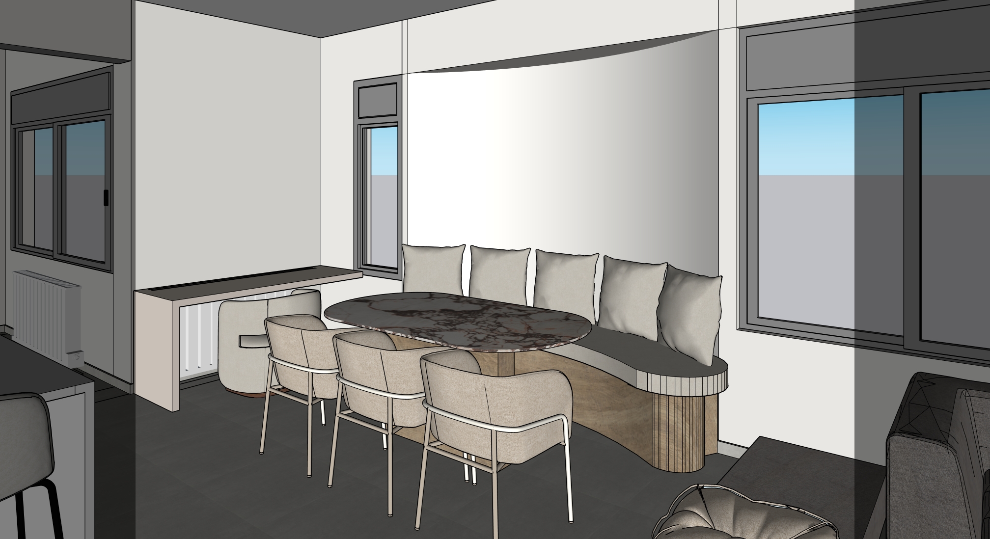 render a modern dinning area interior with a minimalist design incorporate dark wood textures for the window blinds creating a warm and inviting atmosphere the bench base is from wood and pillows of cotton beige fabric the floor is a sleek charcoal gray adding a contemporary feel fashion the chairs with a blend of dark metal legs and light gray upholstery the lighting is soft and ambient casting gentle shadows enhancing a cozy and elegant ambiance