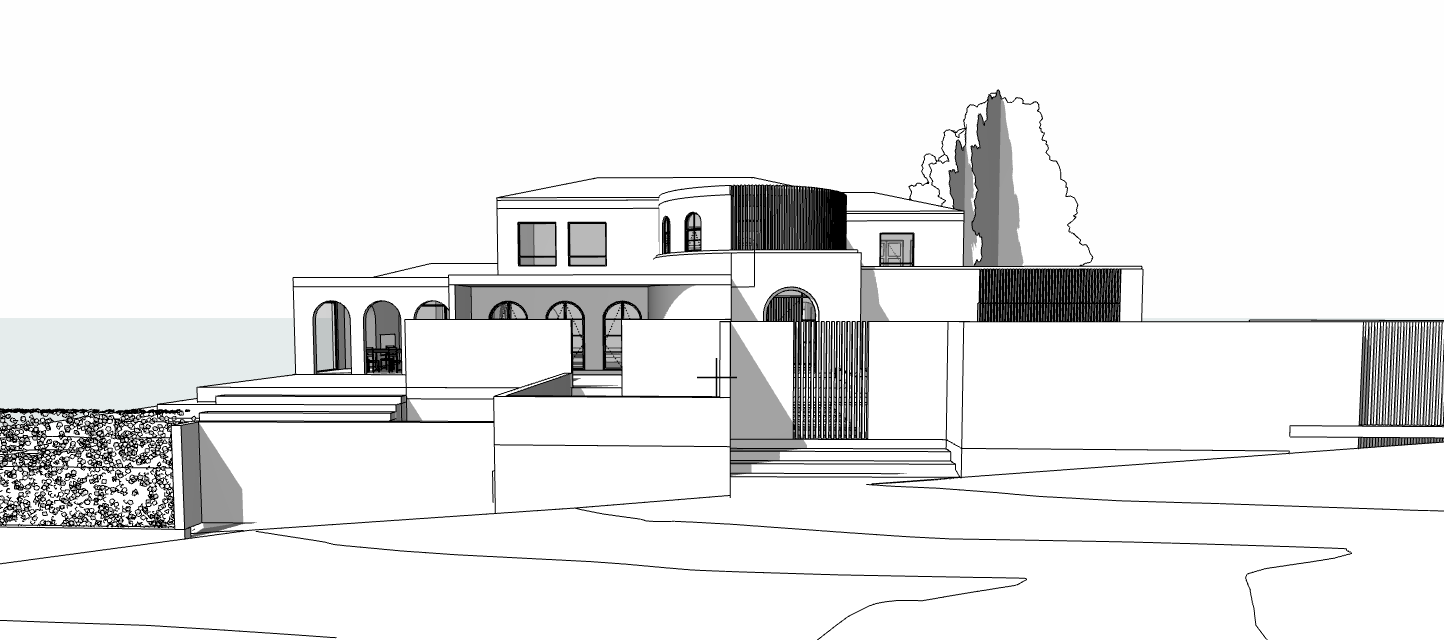 exterior shot keeping the exact design and proportions from the original render the building in a modern mediterranean style with cream plaster walls black joinery glass balustrades with a simple single steel handrail and balusters include a country road landscape in the foreground hills in background