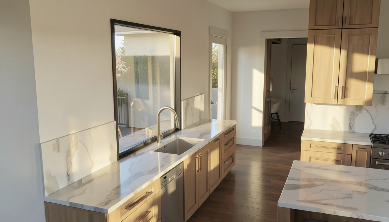 replace the orange tile with vertically oriented natural stone tiles add blossoming lotus and koi fish to the water feature add people to the scene add a few birds in the sky and a humming bird in the foreground with motion blur on its wings