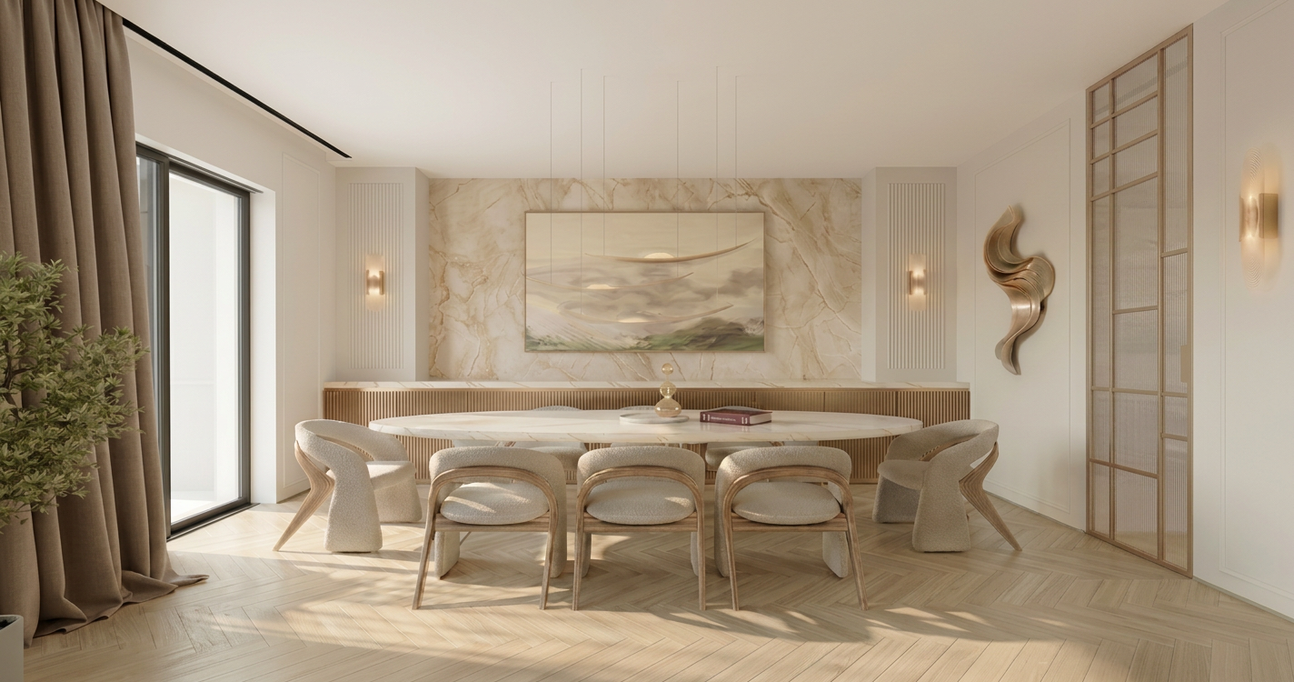 take this semi final render and enhance realism without altering any of the current image s geometry features or objects as well as image orientation no cropping zooming etc final result must be 4k do not add any new objects only alter 1 thing in the entire composition the 2 columns right and left sides of the buffet with the wall lamps on them should have only their wall moldings the ribbed detail in the middle of their frames should be removed aside from that nothing else changes result should be 4k as input