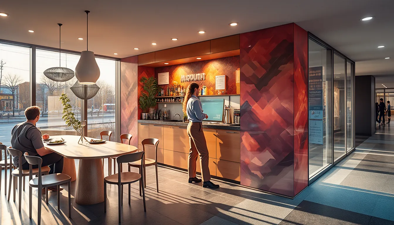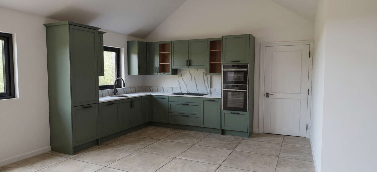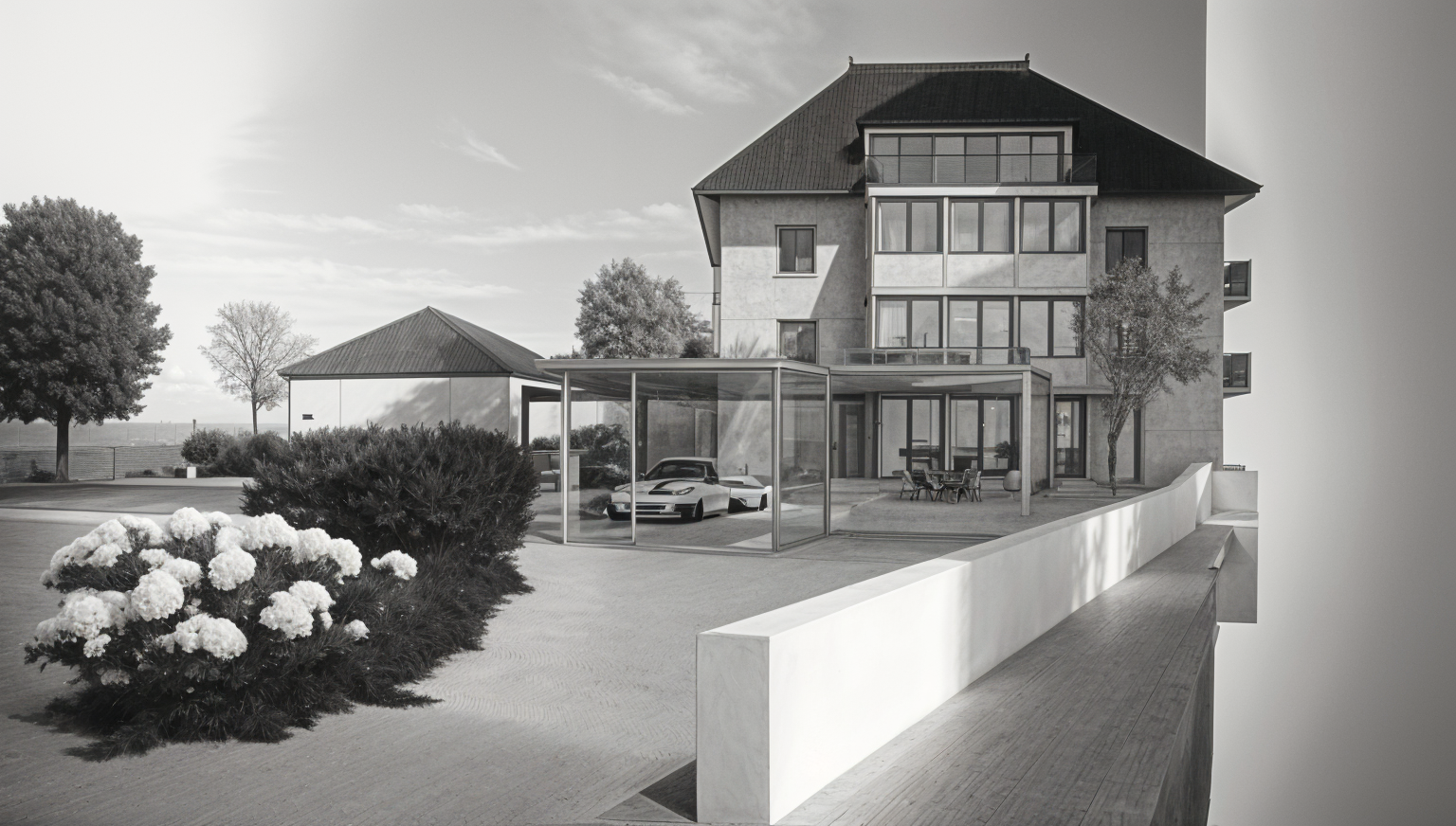 render a modern house with a sleek contemporary design the main structure should be composed of smooth gray walls and a dark gray sloped roof the extension features natural wood paneling with large glass doors and windows providing a seamless indoor outdoor experience the ground should be covered in lush vibrant green grass contrasting with stylish black stone steps and patio area the building is set within an residential street of brick housing set the scene under a clear blue sky with warm soft lighting to create a serene and inviting atmosphere