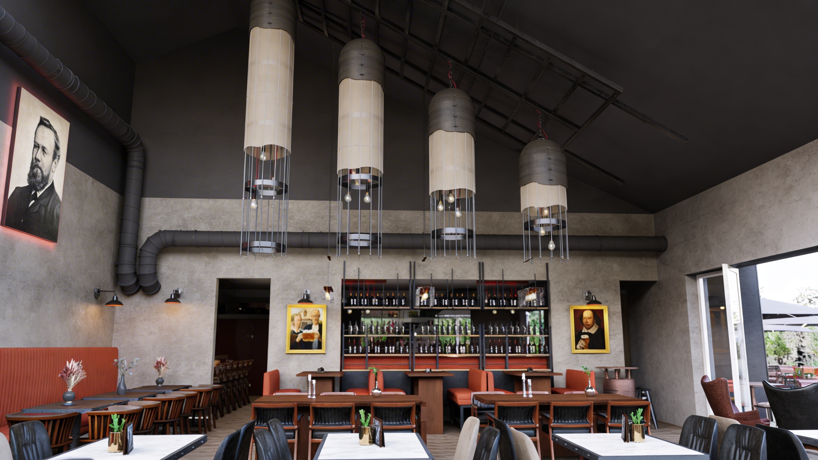use the provided image as a strict reference for camera angle composition proportions furniture placement and architecture maintain the exact geometry and layout of the scene transform the reference into a high end photorealistic interior visualization with refined materials and natural lighting soft sunlight enters through the large window on the right side creating gentle shadows and a calm atmosphere living area a medium dark green fabric sofa with rich woven textile texture is placed along the wall the green color should be slightly cool toned and elegant below the sofa is a light grey rug with a soft but visible fiber structure the two coffee tables in front of the sofa are made from light warm toned concrete matte surface with subtle natural imperfections kitchen cabinetry is terracotta colored with precise integrated milled finger pull handles following the reference geometry upper kitchen cabinets are black stained wood with subtle wood grain the upper cabinet corner near the window is rounded creating a soft curved transition at the end of the cabinet the countertop is light grey stone with a refined matte finish install warm led strip lighting under the upper kitchen cabinets creating soft functional illumination of the countertop the wall on the right side near the window is finished with warm toned concrete microcement plaster this surface continues seamlessly into the kitchen corner and also forms the backsplash area beneath the upper kitchen cabinets creating one continuous material surface the kitchen peninsula is rounded on the side where the passage occurs the base of the peninsula forms a precise semicircle creating a soft curved circulation path the countertop extends beyond this curved base forming a slight overhang that creates comfortable leg space for seating on the upper part of this wall there is a wall mounted air conditioning unit behind the sofa there is also a small flush service door outline finished in the same microcement surface dining area near the window a round dining table made from black stained wood stands near the window the table has a beige sculptural base with a soft matte finish around the table are dark green dining chairs in a slightly cooler green tone elegant and modern with dark frames seat upholstery in textured fabric and backrests made from woven natural rattan cane window and curtains large window and balcony door allow soft natural daylight to fill the interior light textured curtains hang on both sides of the window ceiling and lighting the ceiling is finished with smooth white plaster flooring the floor is brown natural oak wood matte finish with subtle grain style ultra photorealistic architectural visualization natural materials soft daylight warm balanced tones high material realism subtle imperfections elegant modern apartment interior architectural photography style