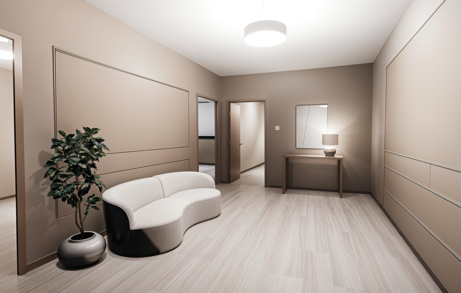 a cozy and elegant hotel room interior the walls are painted a warm beige the floor is covered with a rich olive green carpet a classic wooden rocking chair sits in the corner adding a touch of rustic charm architecture