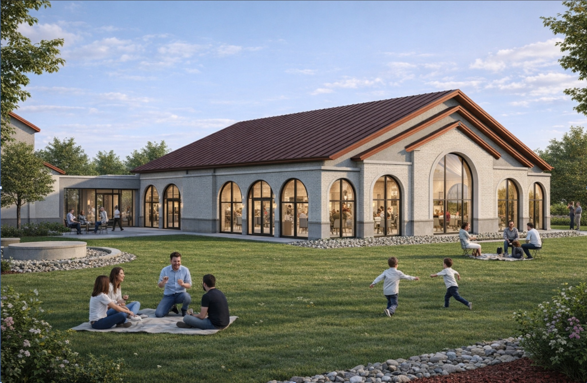 photorealistic architectural visualization of an orthodox church community hall preserve the exact architecture proportions windows rooflines and geometry do not change the building design ultra realistic materials light limestone brick copper standing seam roof with subtle patina reflective glass windows natural material imperfections beautiful landscaped courtyard with stone paving ornamental grasses shrubs and small trees typical of northern michigan families walking children playing people conversing naturally late afternoon golden sunlight with soft shadows cinematic sky with realistic clouds global illumination professional architectural photography 35mm lens ultra high resolution extremely realistic