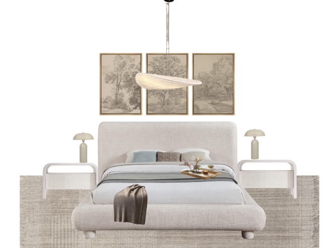 modern minimalist bedroom with a cozy tranquil atmosphere the bed is adorned with plush white bedding and four soft beige throw pillows a textured light brown throw blanket is elegantly draped across the end of the bed the bedframe and matching side tables are made of light white wood creating a warm inviting feel a stylish pendant light hangs from the ceiling casting a gentle natural glow the window is on the left and the exterior is a intracoastal view the art and furniture needs to be the same as the moodboard