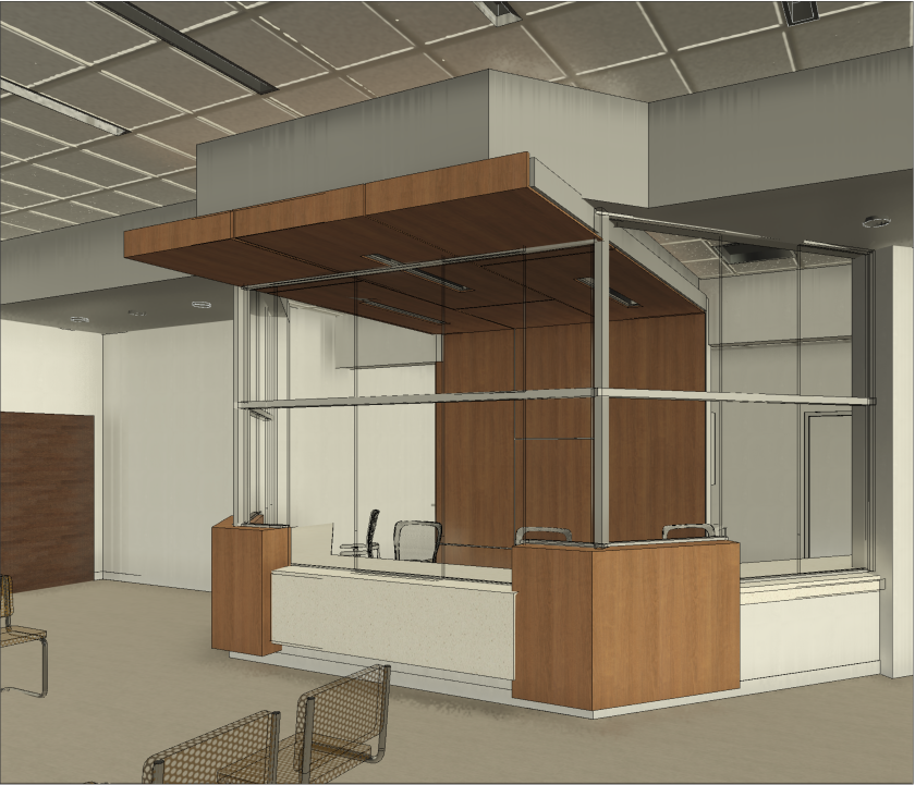 modern reception desk with white solid surface and wood paneling surrounded by sliding glass panels there is a wood paneled wall behind and over the desk the floor is a matte blonde wood vinyl plank