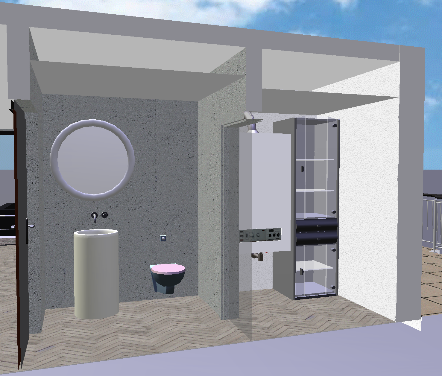 genau dieses rendering berarbeiten fotorealistisches innenraum foto exakt dieselbe perspektive und kameraposition wie das hochgeladene referenzbild 100 identische raumgeometrie exakt gleiche m belanordnung exakt gleiche verlegeart und richtung von parket wie vorlage parket ruhig und hellgrau weiches nat rliches tageslicht raum k nstlich ausleuchten sanfte realistische schatten realistische materialien echte holztexturen hochwertige oberfl chenreflexionen lavabo aus marmor collemandina grigio in braungrau dunkel dahinter eine gessi wandarmatur edelstahl vollkommen rahmenloser und hinterleuchteter spiegel mit echten spiegelungen der grauen schrankanlage 1 meter hinter dem r cken modell circus 90 cm von antoniolupi rechts davon die toilette in schwarz matt toilette modell laufen riva tecelux bet tigungsplatte aus glas schwarz toilettenpapierhalter in edelstahl mit papier rechts von der toilette ebenfalls rechts hinten eine toilettenb rste an der wand aufgeh ngt in edelstahl matt alle sichtbaren grauen w nde seite sind sichtbeton rechts weissputz weiss links vom lavabo eine kurze handtuchstange mit weissem handtuch im raum rechts ist die technik es ist ein sehr grosses l ftungsger t an der wand aufgeh ngt daneben steht rechts das rack mit der haustechnik und den computern in beiden r umen abgeh ngte decke links abgeh ngt auf 2 30 meter rechts auf 2 20 meter schwarze runde deckenspots in der abgeh ngten decke sehr moderner minimalistischer look nat rliche farbwiedergabe golden hour feeling hell ausleuchten eine echte frau mit blonden haaren steht vor dem lavabo die frau ist 170 cm gross das bild muss wie eine professionelle fotografie aussehen es soll ein echtes und reales foto sein canon eos r5 35 mm festbrennweite f 2 8 hyperrealistisch dslr qualit t raw aufnahme 8k aufl sung extrem scharf perfekte tiefensch rfe professionelle architekturfotografie