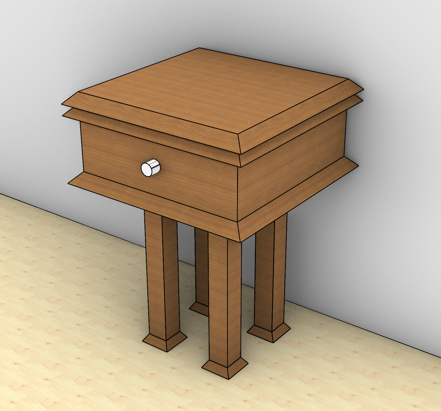 this is a table in cherry wood it has 1 drawer with a metal knob there is a wood floor in lighter oak the wall is white make it photo realistic crisp lighting