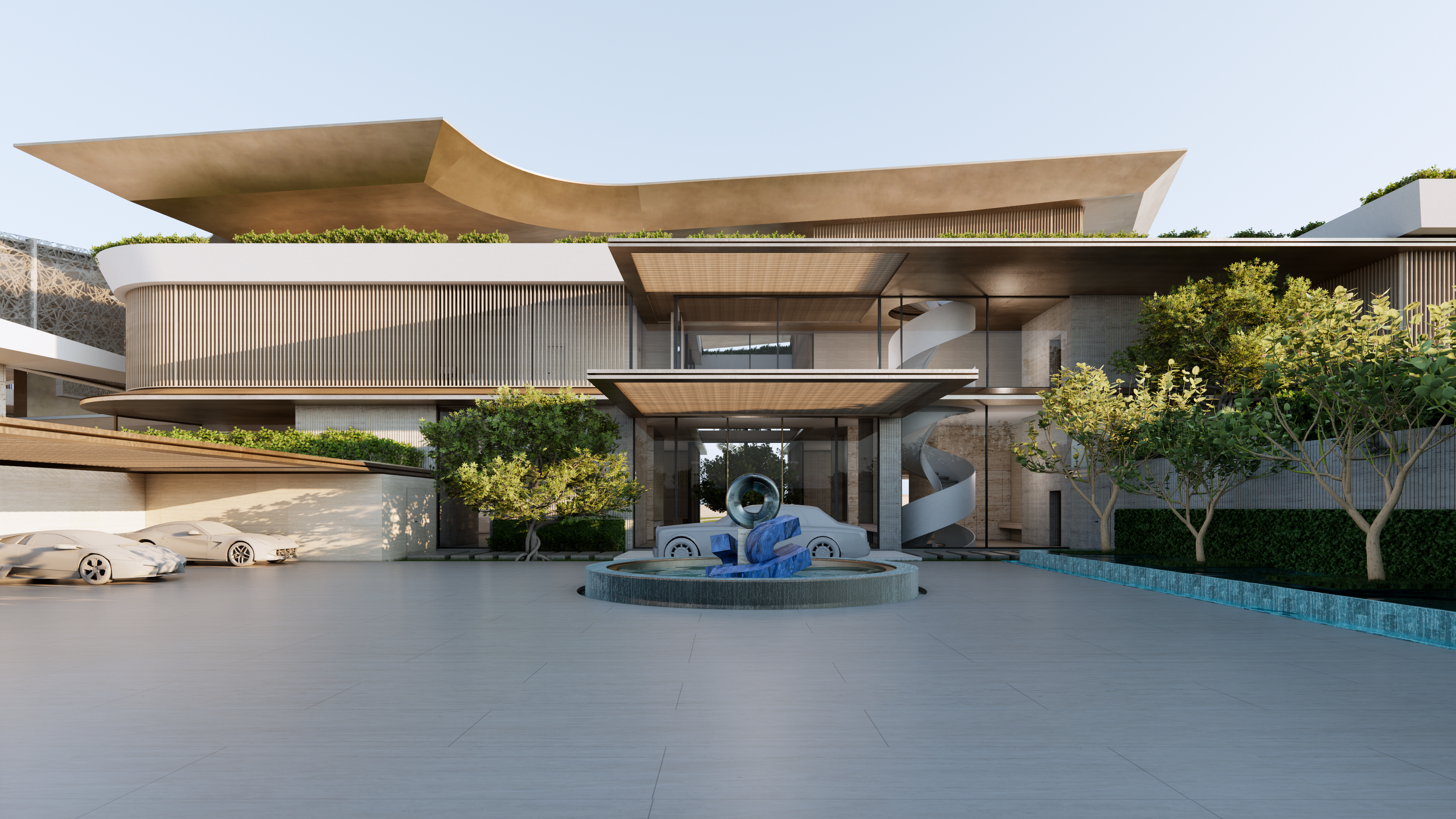 exterior shot stunning modern architectural building with expansive roof overhangs featuring a mix of light beige and dark brown concrete materials horizontal wooden slats provide texture and depth the teal blue swimming pool in the foreground complements the greenery of palm trees and shrubs creating a tropical oasis atmosphere sunlight casts dynamic shadows enhancing the luxurious and inviting ambiance the sky is clear and light blue suggesting a pristine and serene environment architecture