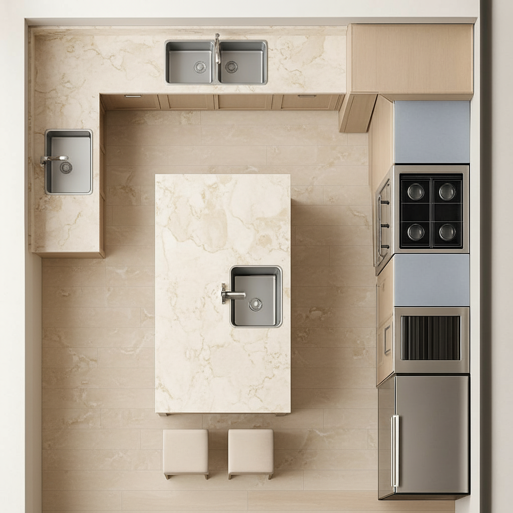 interior shot render a luxurious and modern bathroom design with a serene atmosphere the walls should be a soft dove gray to create a calming effect the double vanity area spanning 72 inches should have white marble countertops with elegant black faucets place a large frameless mirror above with modern lighting fixtures the floor is covered with light beige tiles adding warmth for the shower area use large glass panels with chrome fixtures and a built in seat the shower walls are tiled in a sleek white subway pattern include soft lighting from recessed ceiling lights a plush white bath mat and fluffy towels add a touch of coziness