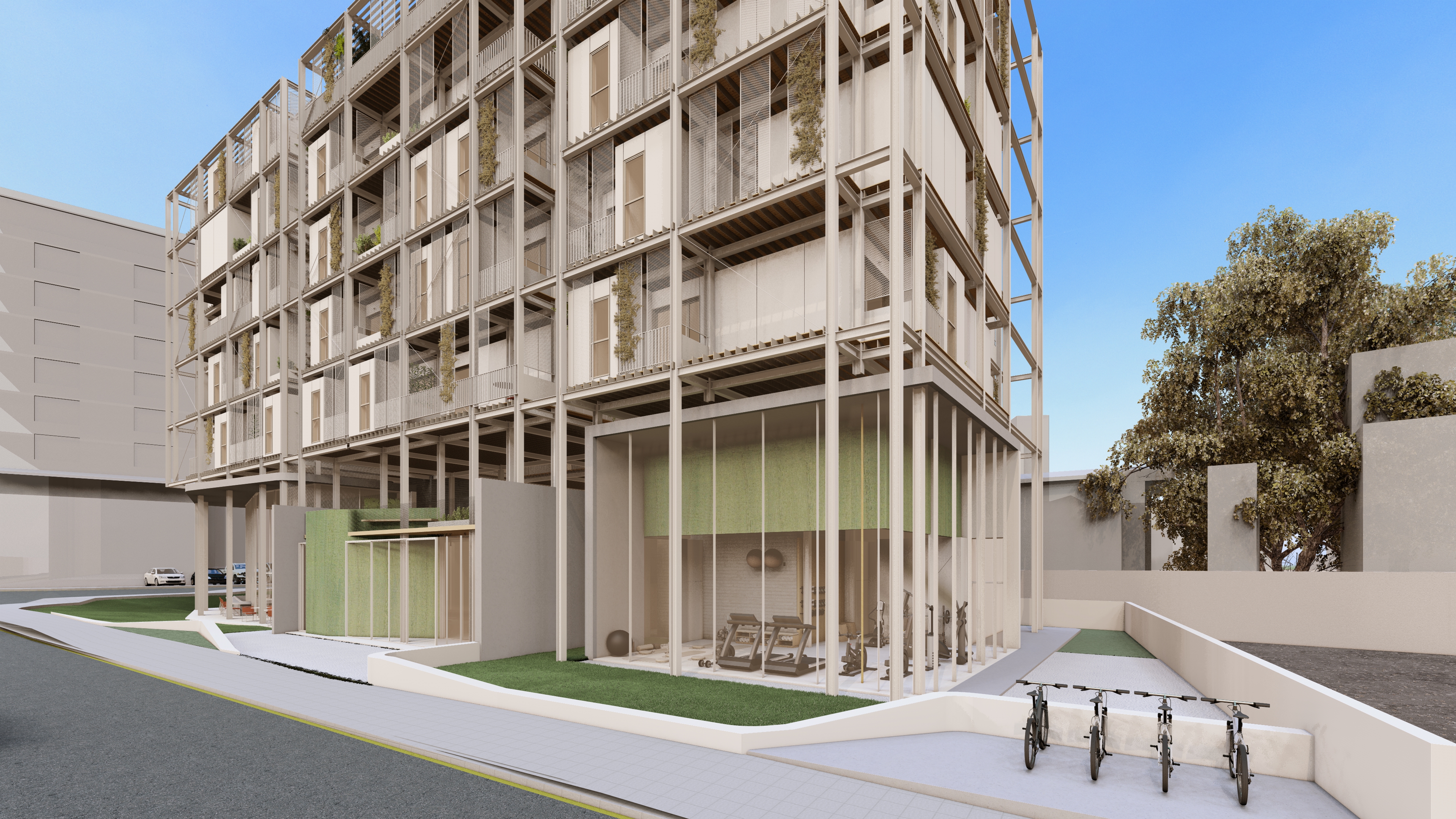 dont change the features of the building just make a render also try the base of the render to be white at the right of the floor add gym elements
