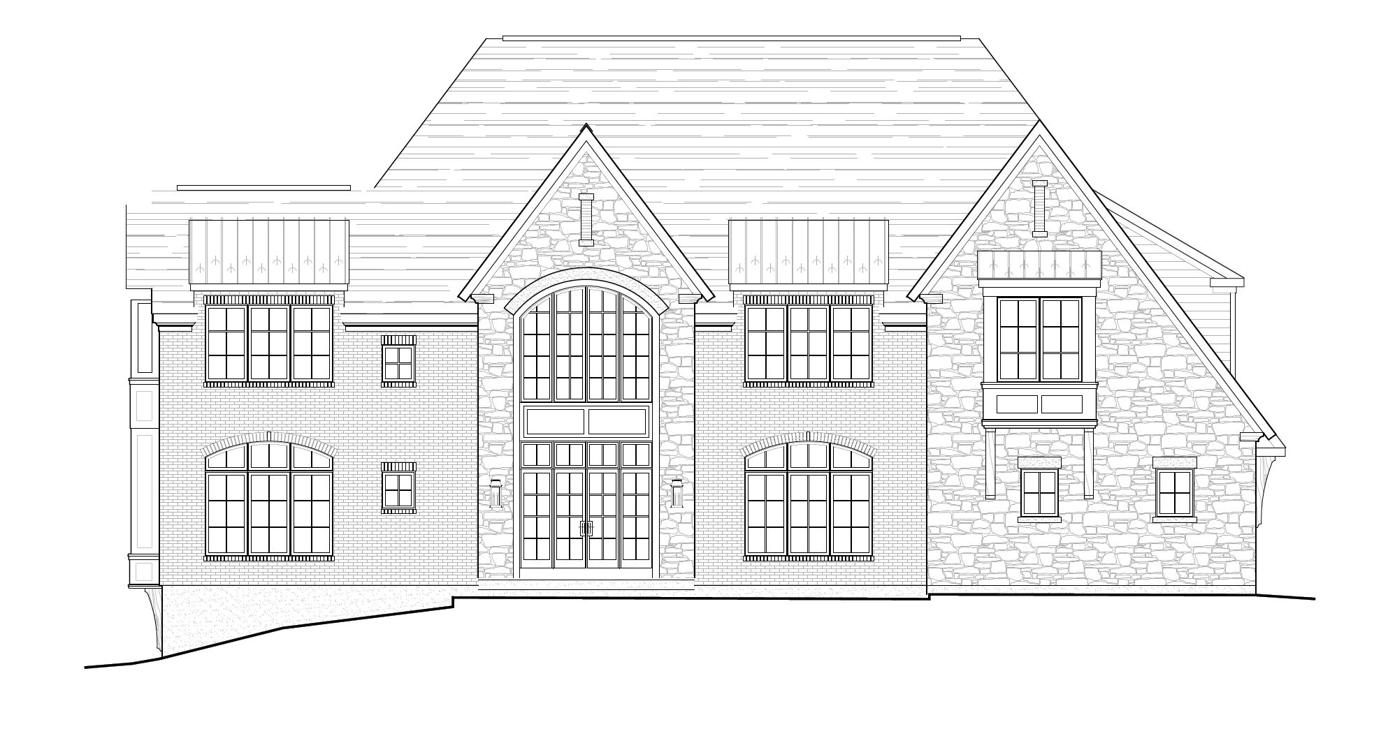 gables to be stone painted sherwin williams alabaster brick and siding to be painted sherwin williams alabaster roof to be asphalt shingle in rustic black metal standing seam roof to be black front door to be black metal panels above front door to be metal black windows black aluminum clad box bays to be charcoal color set in a suburban subdivision lot sloping gently down from right to left