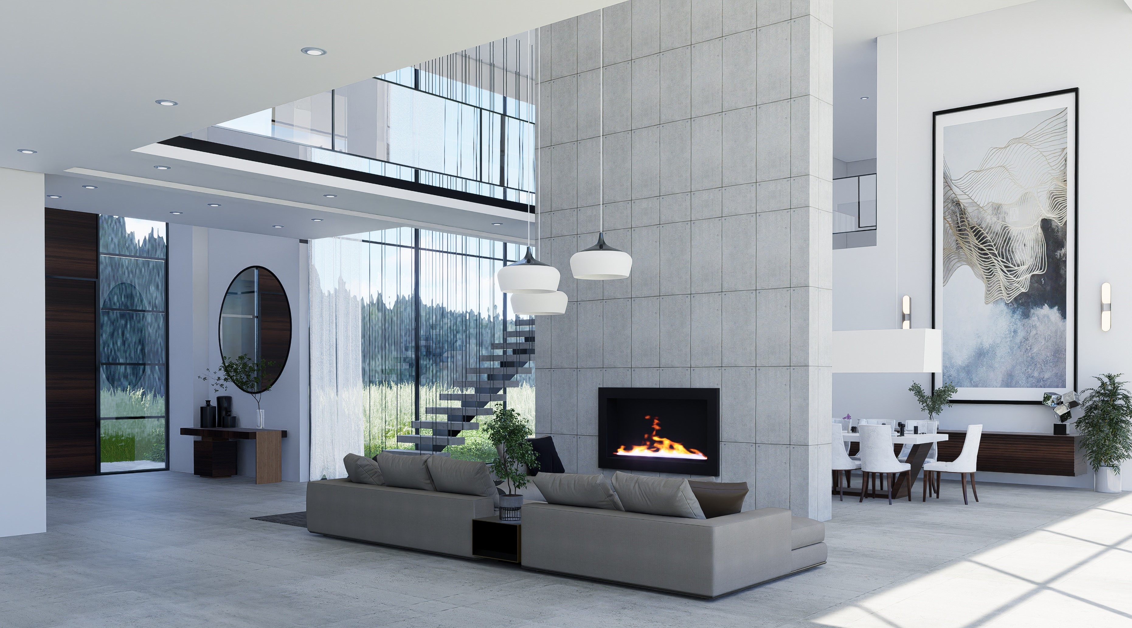 add more decor and a few plants as well as a rug under the sofa make the outside a forested area change the fireplace to a cement fireplace with a dark wood mantel with decor on it