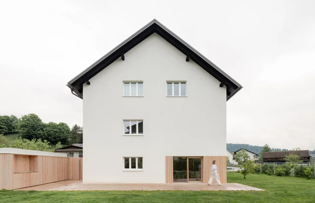 make wooden facade in uper part of the house put som trees araund please with normal facade with no wood but dark color
