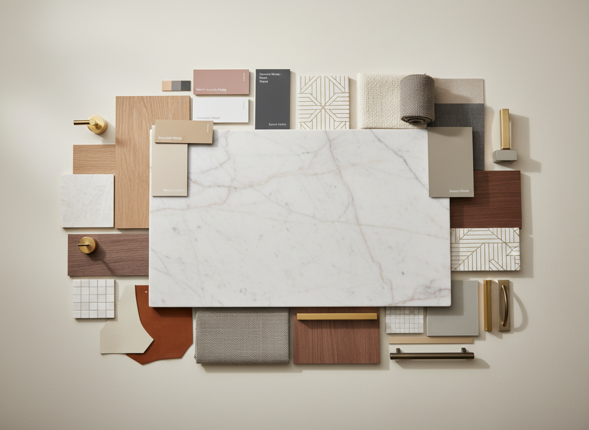 render a high end designer southern style kitchen from the moodboard featuring a slab of calacatta zambia as the countertops and backsplash show any light fixtures as illuminated and add warm sunlight from nearby windows ensure there are several plants around the space and staged with food prep calacatta zambia has soft subtle veins of pale gray and blush pink