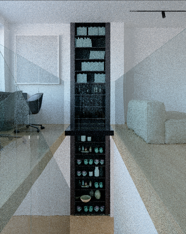render a modern interior space with a minimalist aesthetic include a central black bookshelf with glass doors with led lightning in every shelfs filled with books bottles and dishes the surrounding walls are pristine white contrasting with the light oak wooden floor on the left place a sleek modern office chair in charcoal gray next to a transparent glass railing on the right add a cozy light beige sofa the atmosphere is calm and serene with soft natural lighting streaming in creating a peaceful and sophisticated ambiance on the left is a modern impressionist painting