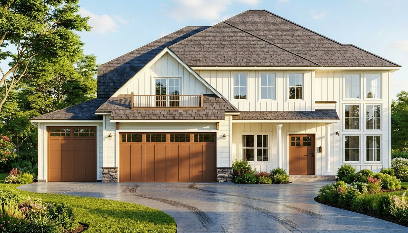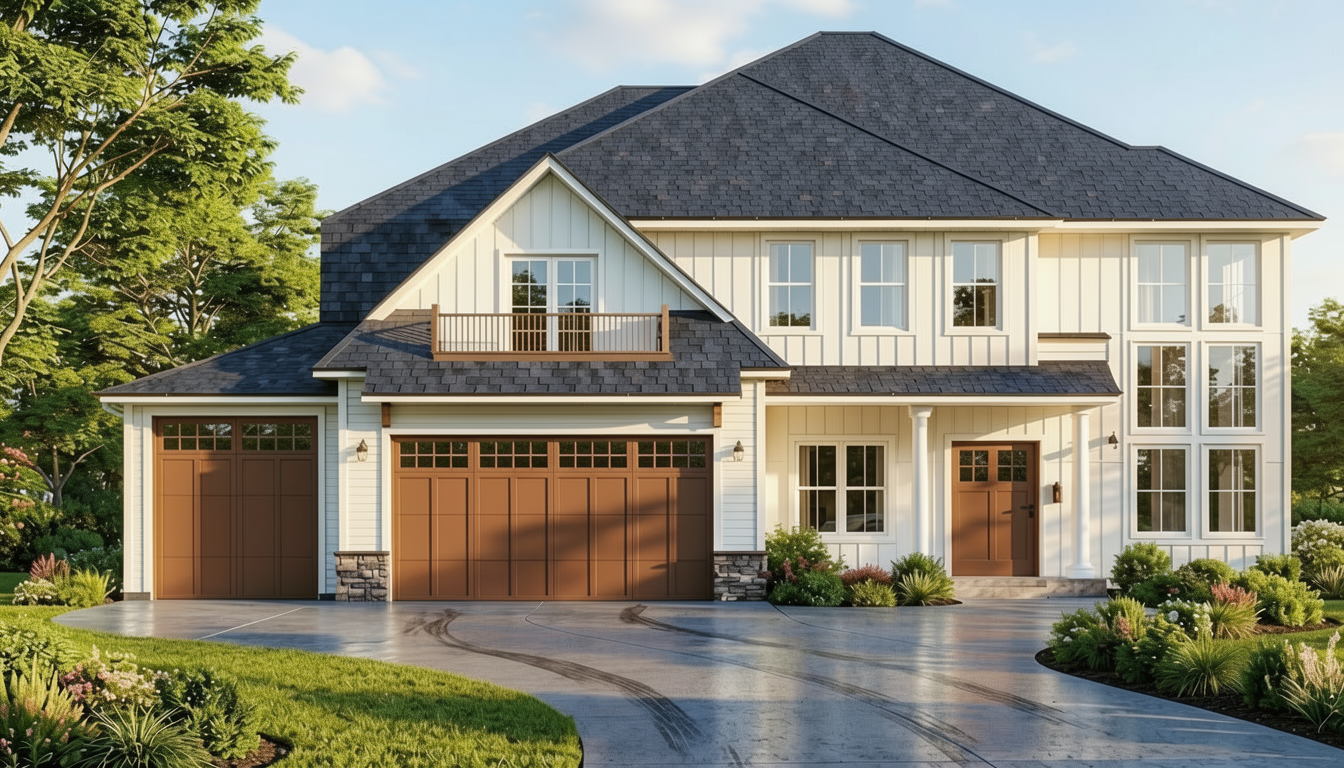 roof only dark grey make garage doors black wood and with glass windows
