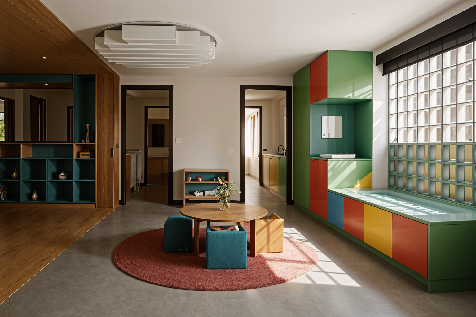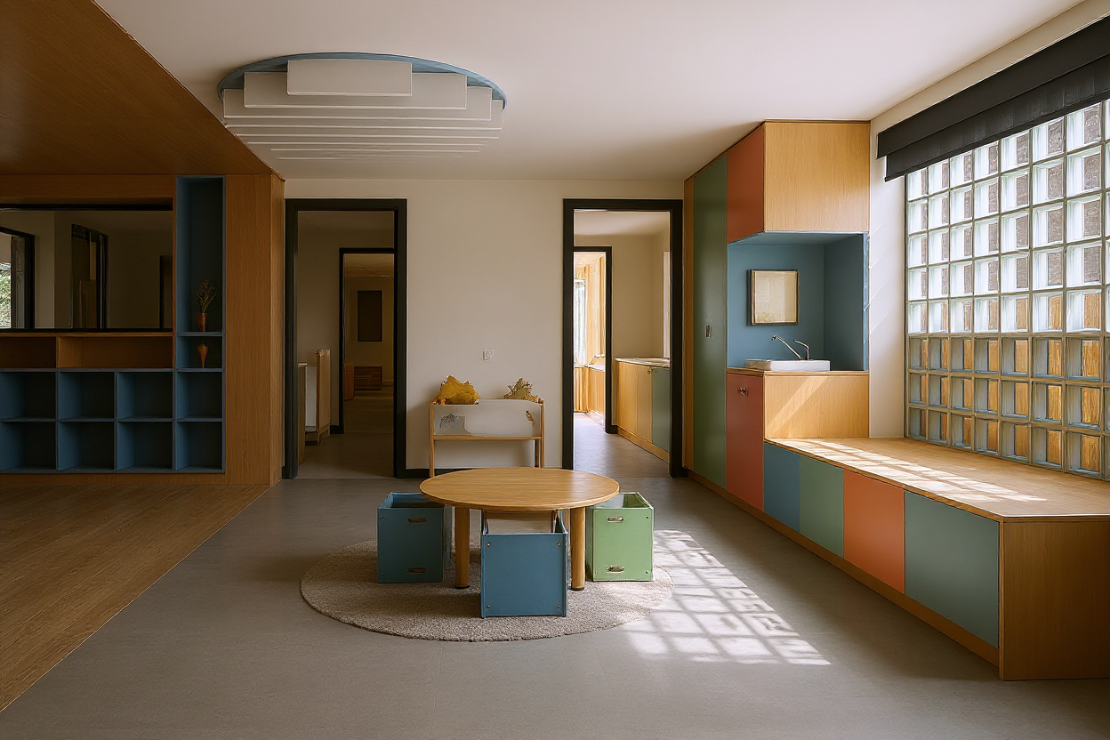 barndominium interior shot a room in a modern classic style with light sand beige walls with a large double bed with blankets and beautiful pillows the protruding wall behind the bed is decorated with decorative vertical slats or stripes next to it is a classic style wardrobe in pastel colors with gold handles also on the side of the bed is a bedside table above the table hangs a sconce that shines a modern chandelier hangs on the ceiling illuminating the room modern roman style curtains hang on the window the skirting board is made of a decorative grille in the same color as the wall and there is also the same decorative grille in the same color as the wall under the window architecture
