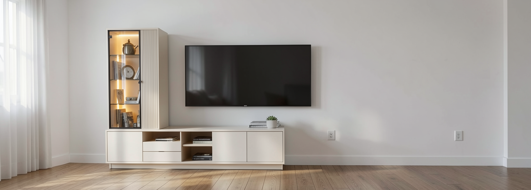 crea una imagen fotorealista de este mueble dentro de un entorno de vivienda vac o con suelo de madera y paredes blancas mant n las proporciones y el dise o de mueble intacto ya que es realista tal cual el cliente lo ha comprado solo queremos una imagen que le haga ver su mueble en un ambiente el tono del mueble es topo clarito y por si no lo aprecias el marco del meuble es biselado es decir sobresale de la puerta y se ingleta hacia dentro