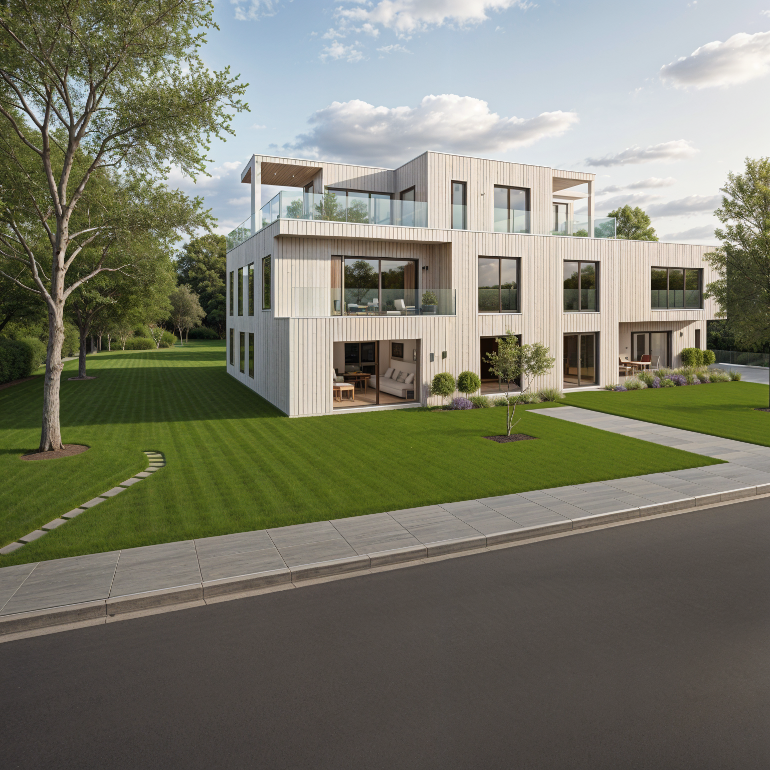 dark granite plint to 4 5m large openings 3 5m high for commercial space four tints of corrugated steel to upper facade change direction of corrugated steel per volume black windows light emitting add people inside and out