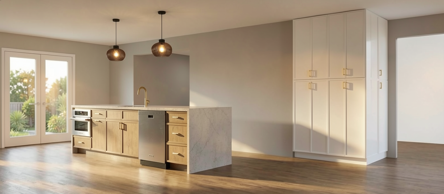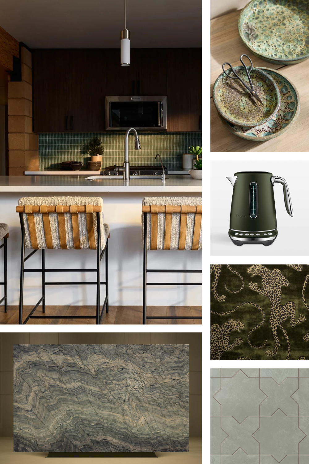 render a high end designer kitchen from the moodboard featuring a slab of fusion quartzite as the countertops and backsplash show any light fixtures as illuminated and add warm sunlight from nearby windows ensure there are several plants around the space and staged with food prep fusion quartzite has ribbons of denim blue taupe and pale olive green veins