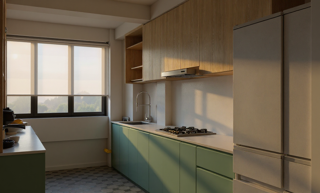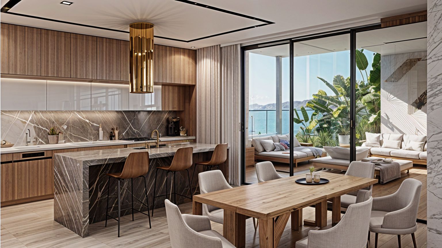 led strip light no door handles glossy quartz counter top and backsplash black and white floor tiles