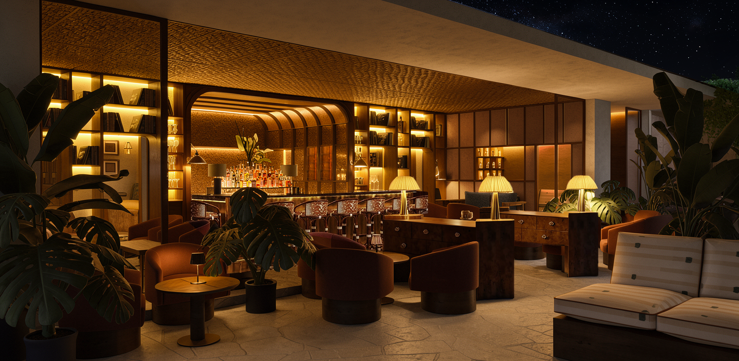 create a cozy elegant lounge scene with warm lighting include rich deep brown wooden furniture with smooth finishes add plush armchairs in a dark blue red use soft ambient lighting to cast gentle shadows place lush green indoor plants with large broad leaves for a natural touch ensure the stone floor has a beige texture enhancing the warm and inviting atmosphere scatter small stylish tables with simple cylindrical lamps emitting a soft glow the plants are uplit creating a warm glow on the terrace the fabric is textured linen navy and the sideboards are a burl wood with metalic brass based table lamps and bamboo shades overall create an atmosphere of sophistication and comfort