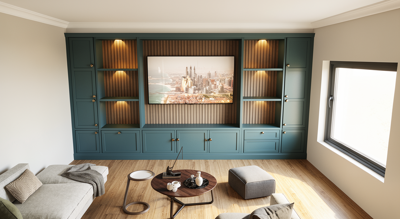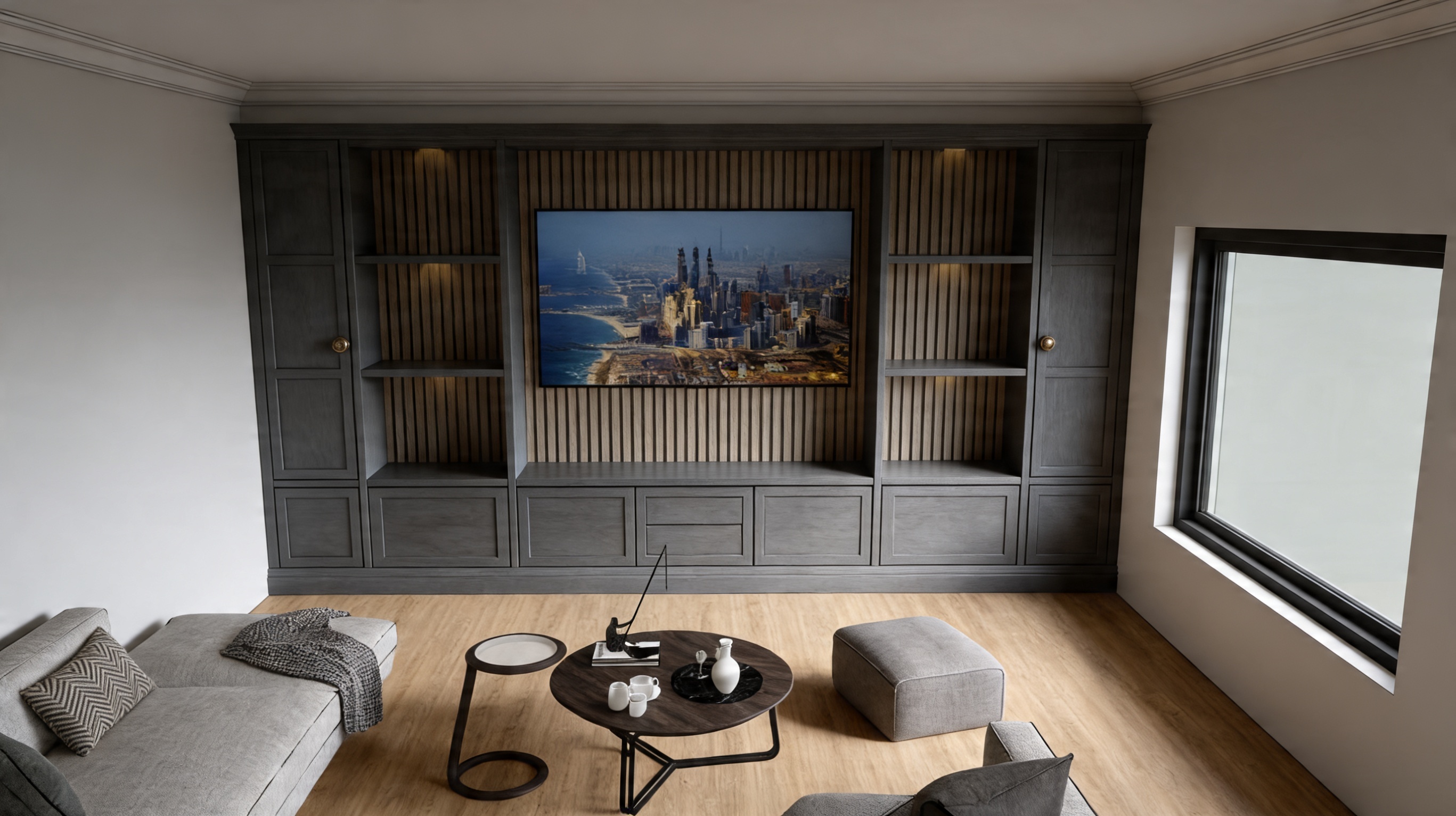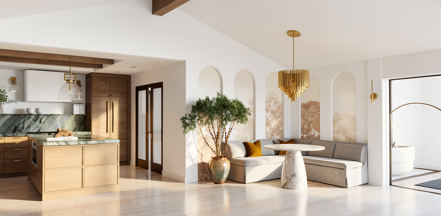 create a render in hyper realistic architectural visualization quality 8k resolution all objects furniture sanitary ware and architectural features must remain in place do not add any objects or delete anything from the image the spatial configuration must remain unchanged warmth gentle reflections soft shadows enhanced color richness and luxurious level realism improve depth and realism through wood grain richness brass highlights fabric texture and polished clarity while keeping the entire scene exactly as originally designed use general daylight lighting in the room but not too bright use a smooth white wall surface above the tiles the wall covering should be the same light color as the floor covering light is coming from kitchen windows on the left side and the light above the dining table is crystal
