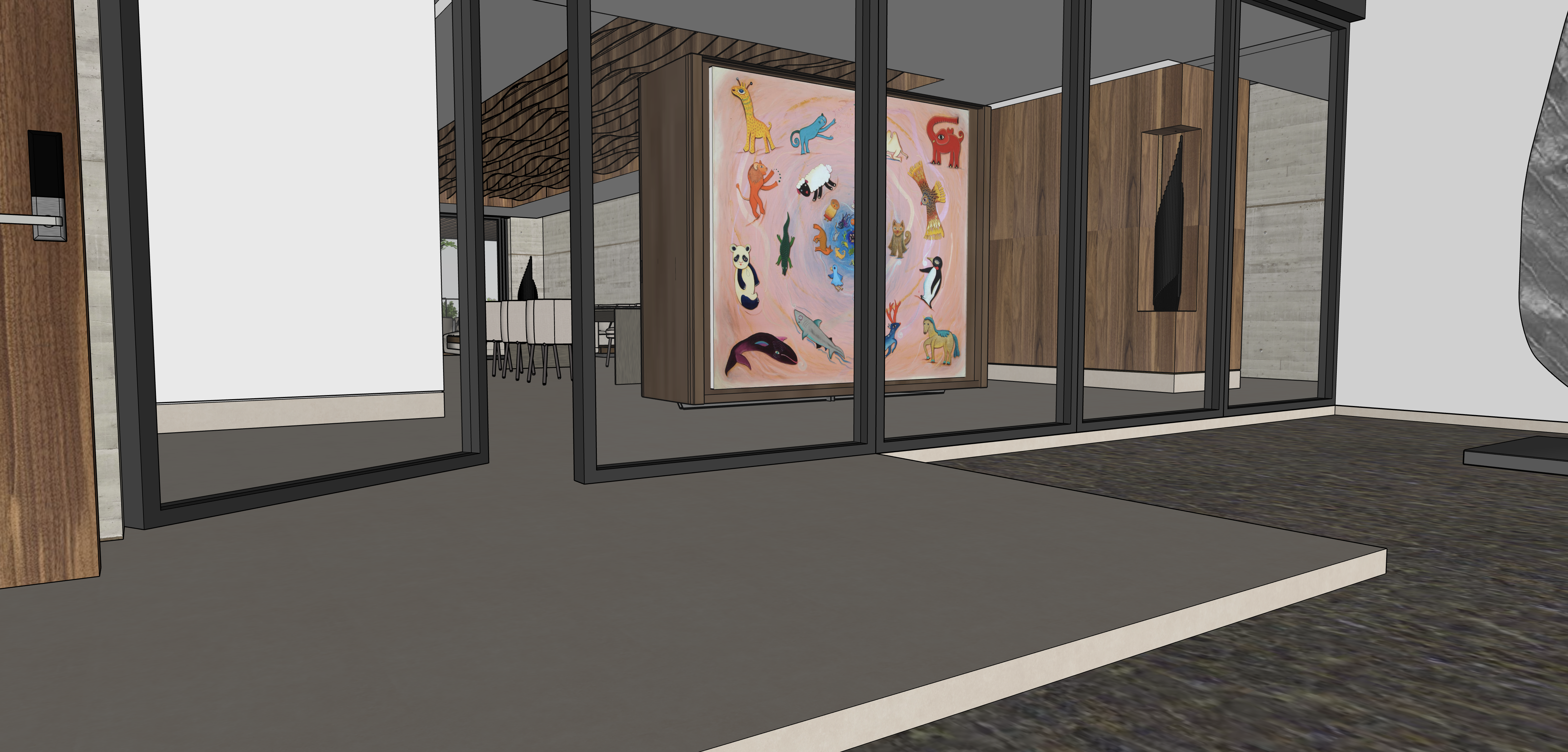 walnut woodwork baffle ceiling with indirect lighting crystal windows and door with graphite framing floor is light beige porcelanosa large painting and corner sculpture with indirect lighting a small entrance pond on the right side of the photo