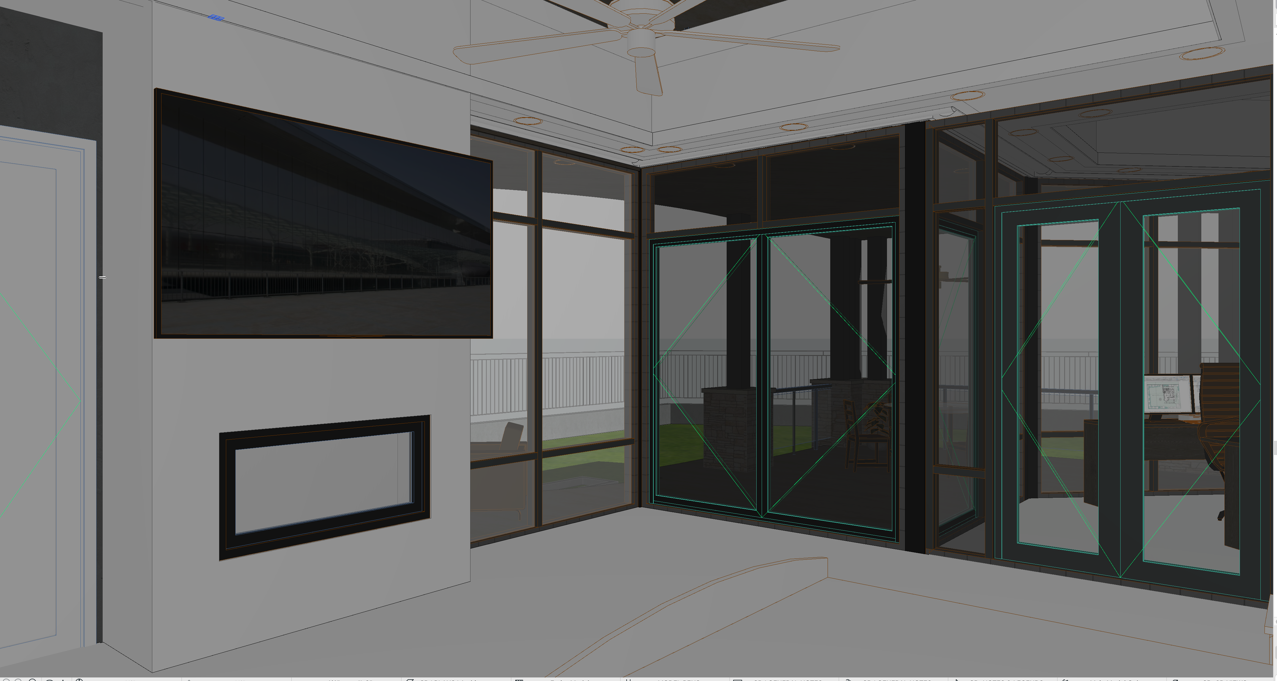 make exterior background be desert hillside render at evening time add accent lighting make floor light wood plank add area rug under bed remove area rug and add king sized bed facing television and centered on fireplace wall rotate bed and area rug 90 degrees to the righthand slide back approximately 6 feet from fireplace wall rotate bed area rug and nightstands 180 degrees center on fireplace wall and leave 6 feet of space between fireplace and foot of bed