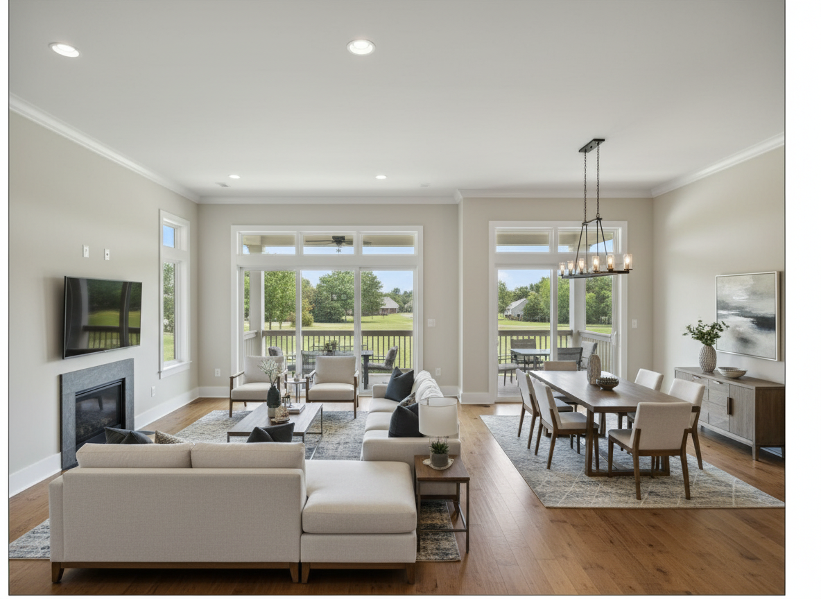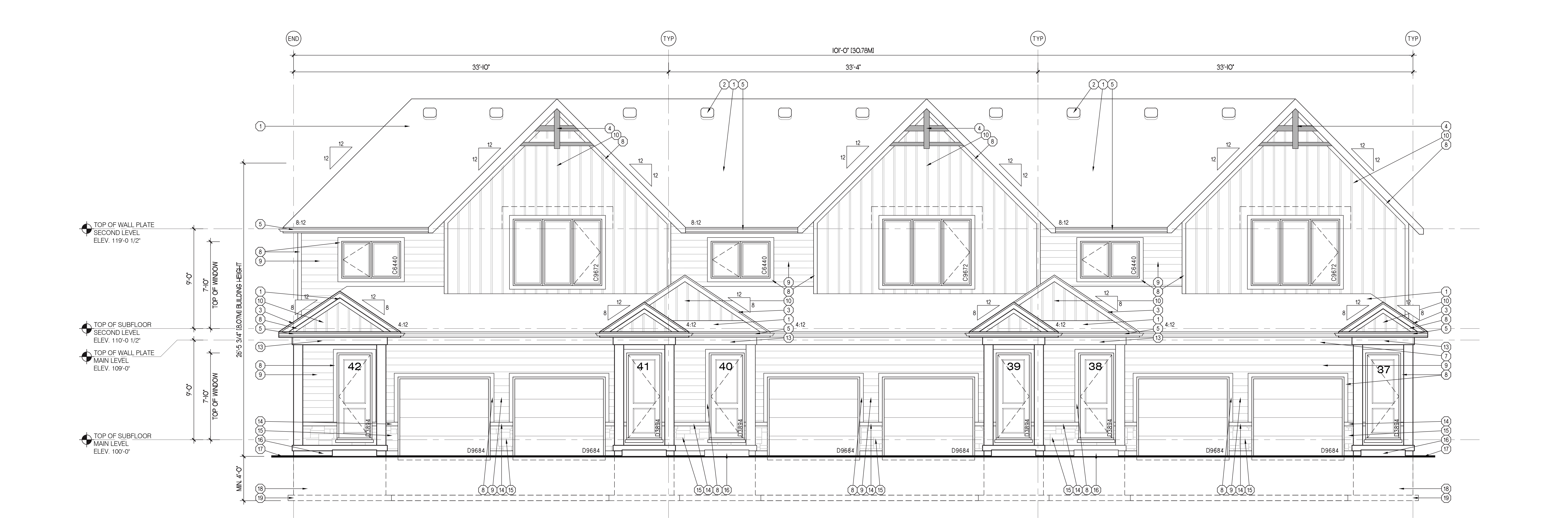 a charming row of townhouses with modern architecture the exterior features a harmonious blend of soft grey and white siding creating a contemporary yet welcoming appearance the roofs are covered with dark grey shingles adding a sleek contrast windows are large and framed in crisp white allowing natural light to illuminate the interior front doors are a bold navy blue adding a touch of elegance the overall atmosphere is serene and suburban with manicured lawns and light landscaping adding to the picturesque setting the sky is a clear blue with a few fluffy white clouds enhancing the peaceful ambiance