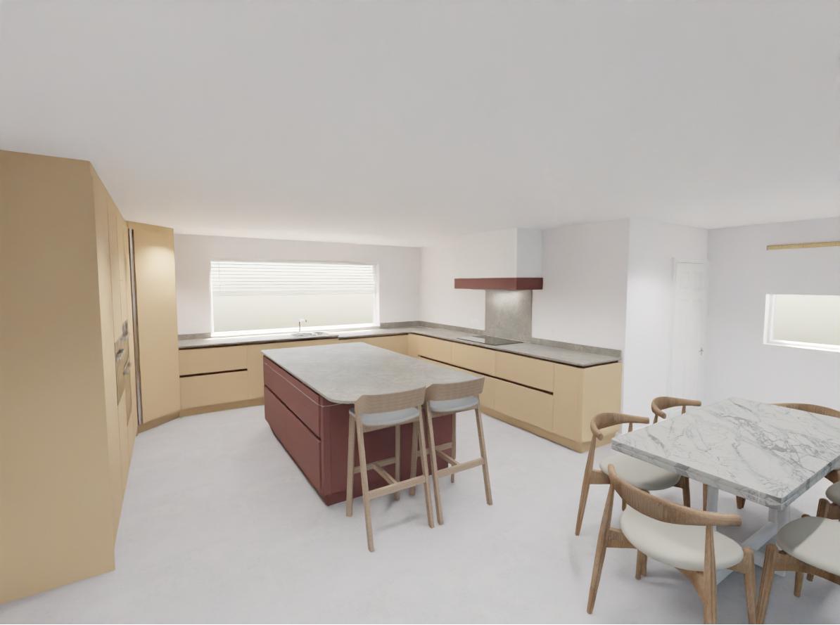 full dress the kitchen add a view to the windows keep the tall angled larder unit all drawers to be plain and handleless make scene as sunrise add pendants above island unit
