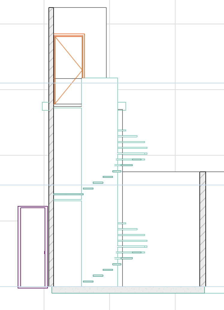 staircase with a metal stringer and steps made of irving steel grating the design should look modern with very clean and refined lines include a simple wrought iron railing that feels minimal yet elegant surround the staircase with garden landscaping for ambiance add indirect lighting integrated into the steps to create a subtle glow the metal stringers should be lacquered in a navy blue finish put the door of the elevator to the left side of the stairs