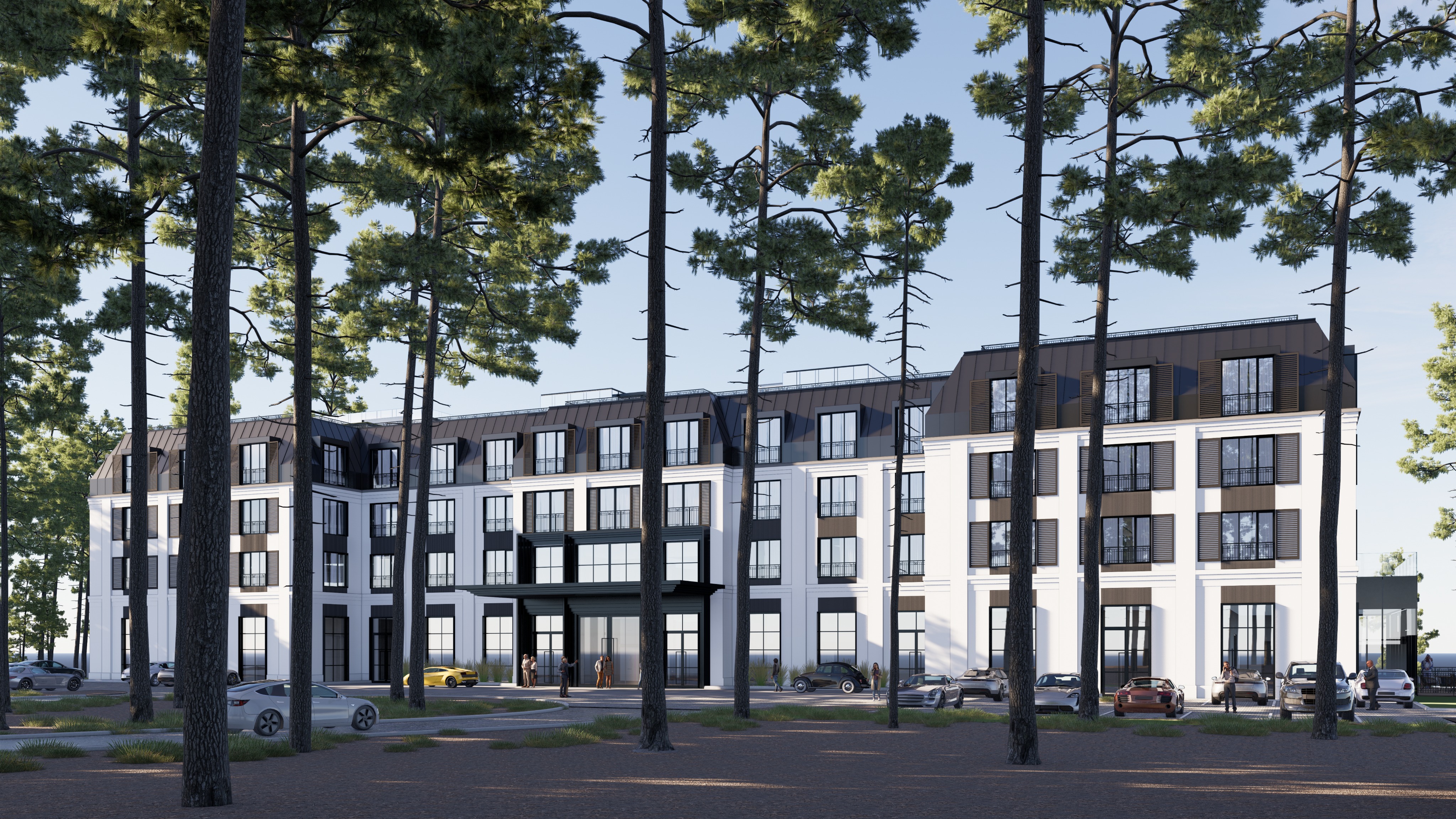 transform this image into a hyper photorealistic architectural visualization replace all non realistic materials with lifelike versions maintaining the dominant color palette add natural subtle sheen and glossy highlights on metals glass wood surfaces create realistic textures on concrete plaster and fabrics with micro details change background to serene lake region surrounded by dense forest enhance surrounding environment to ultra realistic quality while preserving exact structure and shape of bushes trees grass and lake detailed bark textures with moss on trees natural leafy density variation on shrubs short grass blades mixed with soil patches reflective lake surface with gentle ripples realistic water depth and shoreline details preserve natural forest floor under trees as woodland litter and earth leaf litter pine needles moss patches soft brown soil texture blending seamlessly add precise environmental reflections in every glass pane capturing surroundings bright high key lighting throughout with even daylight illumination no harsh shadows clear blue sky with soft clouds ultra detailed 8k photorealistic render professional architectural photography style