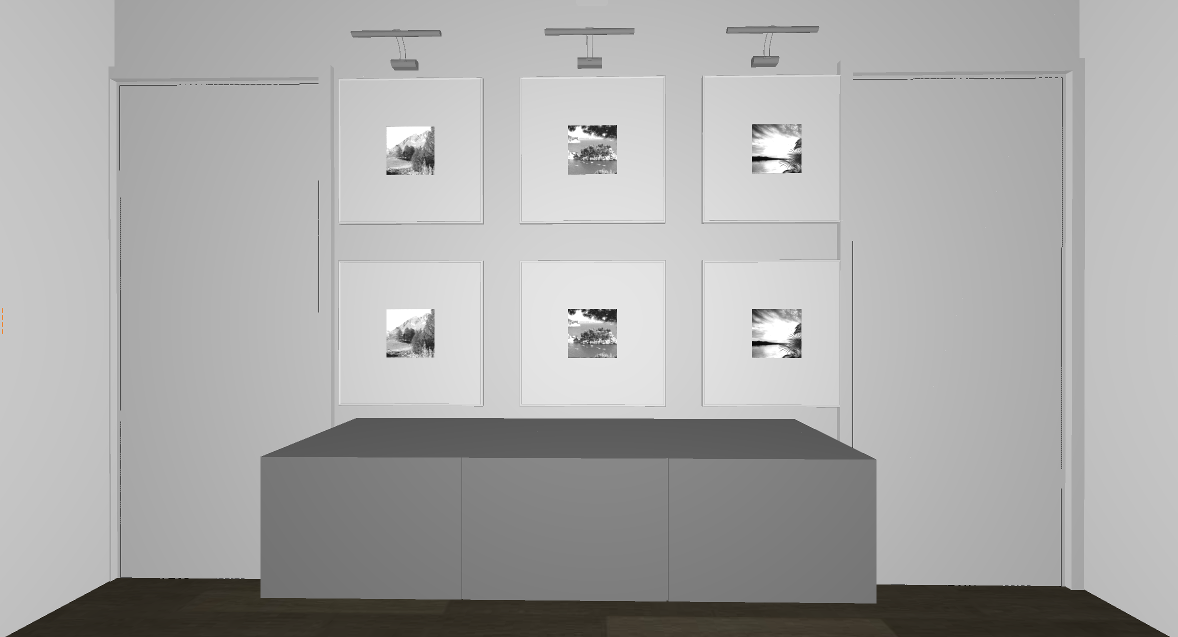 the low cabinet is chrome turn on the wall lights above the frames and add more realism to the render