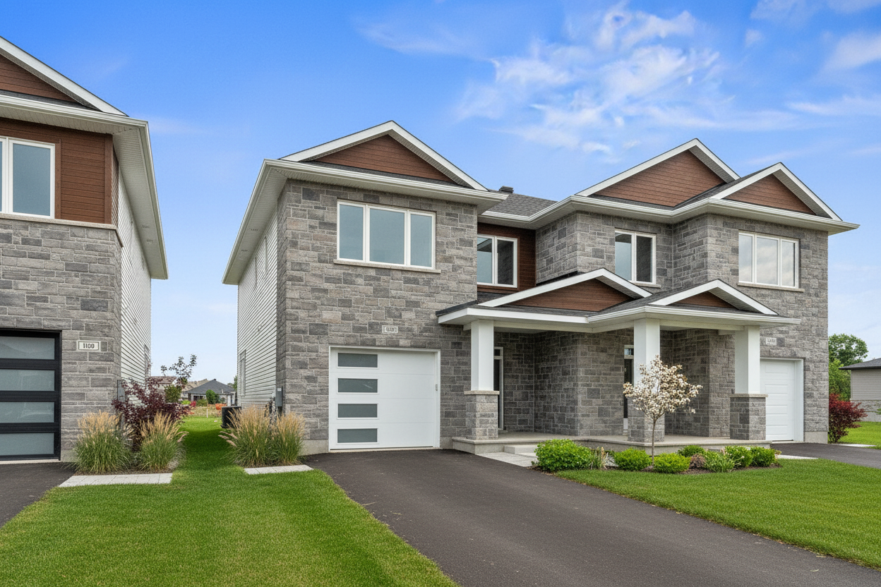 blue sky with few clouds vibrant landscaping white siding and trim dark black roofing