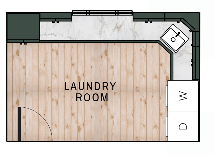 convert this top down floor plan into a realistic interior perspective of a laundry room change the camera from aerial view to eye level as if standing inside the room show walls ceiling depth and realistic proportions maintain the exact layout and placement of all elements including washer dryer sink cabinetry and door location add realistic materials lighting and textures while keeping the design clean and modern do not alter the floor plan layout