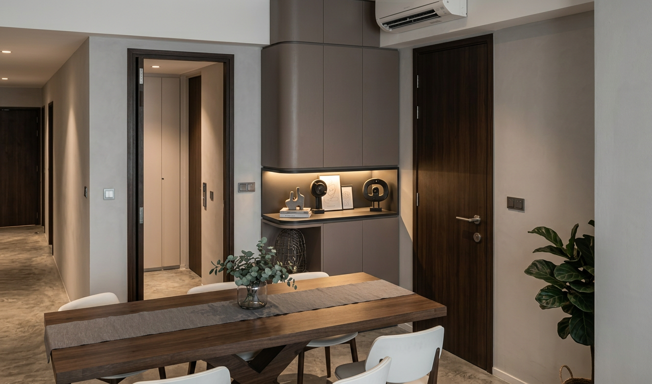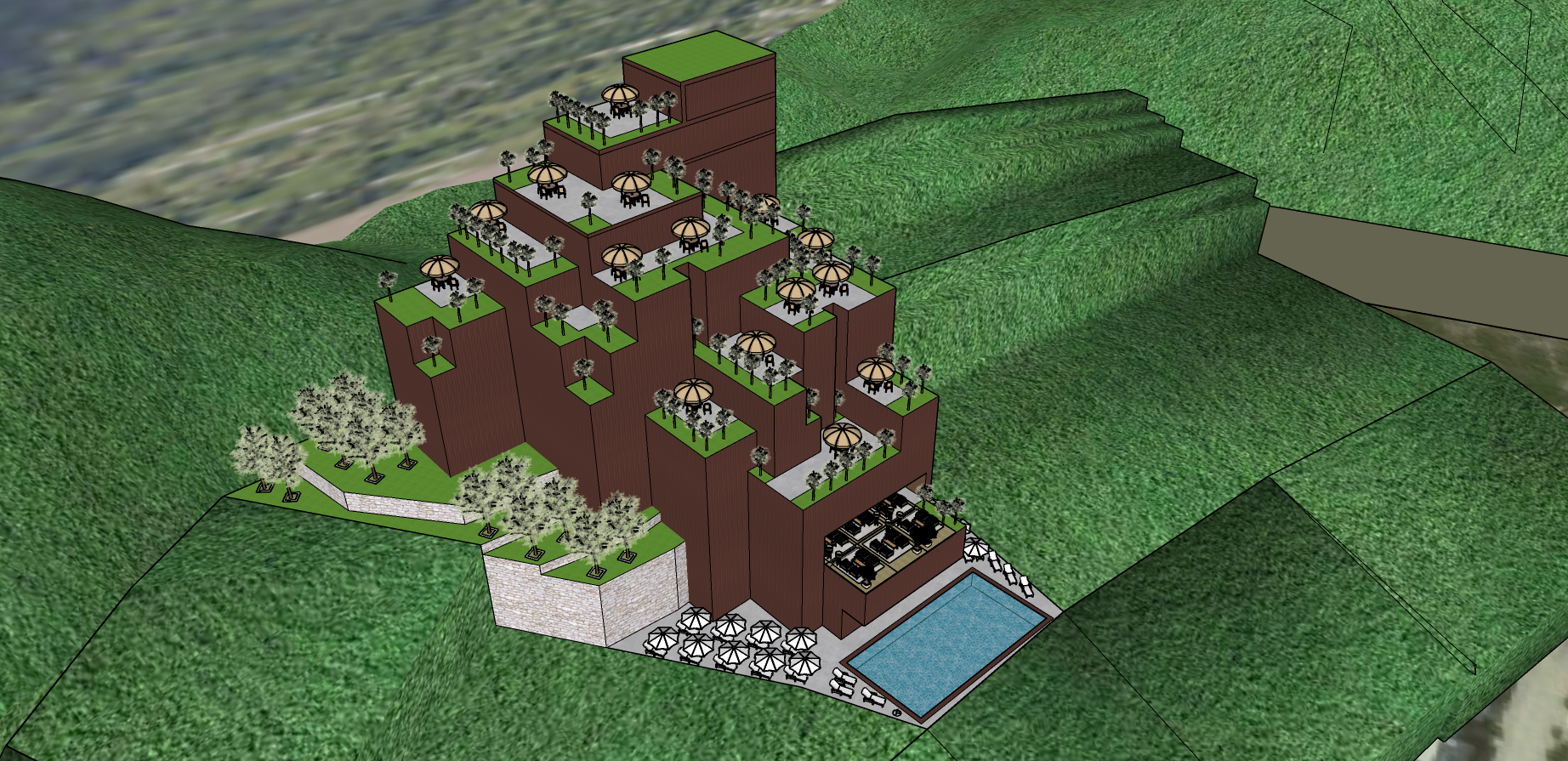 render a stunning architectural resort nestled in lush green mountains featuring cascading terraces with modern structures in deep purple tones put large tall and wide glass doors overlooking the terraces and also many windows in all the walls windows and doors have to prevail over the facade each terrace is adorned with vibrant green lawns and elegant parasols in soft beige the surrounding trees are a mix of muted silver and deep green foliage incorporate a luxurious inviting pool at the base with clear blue water the atmosphere exudes tranquility and harmony with nature with soft natural lighting emphasizing the serene setting