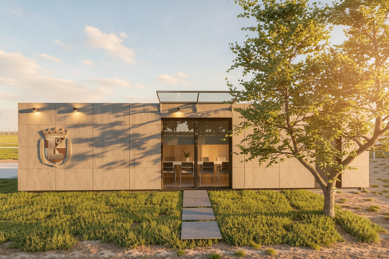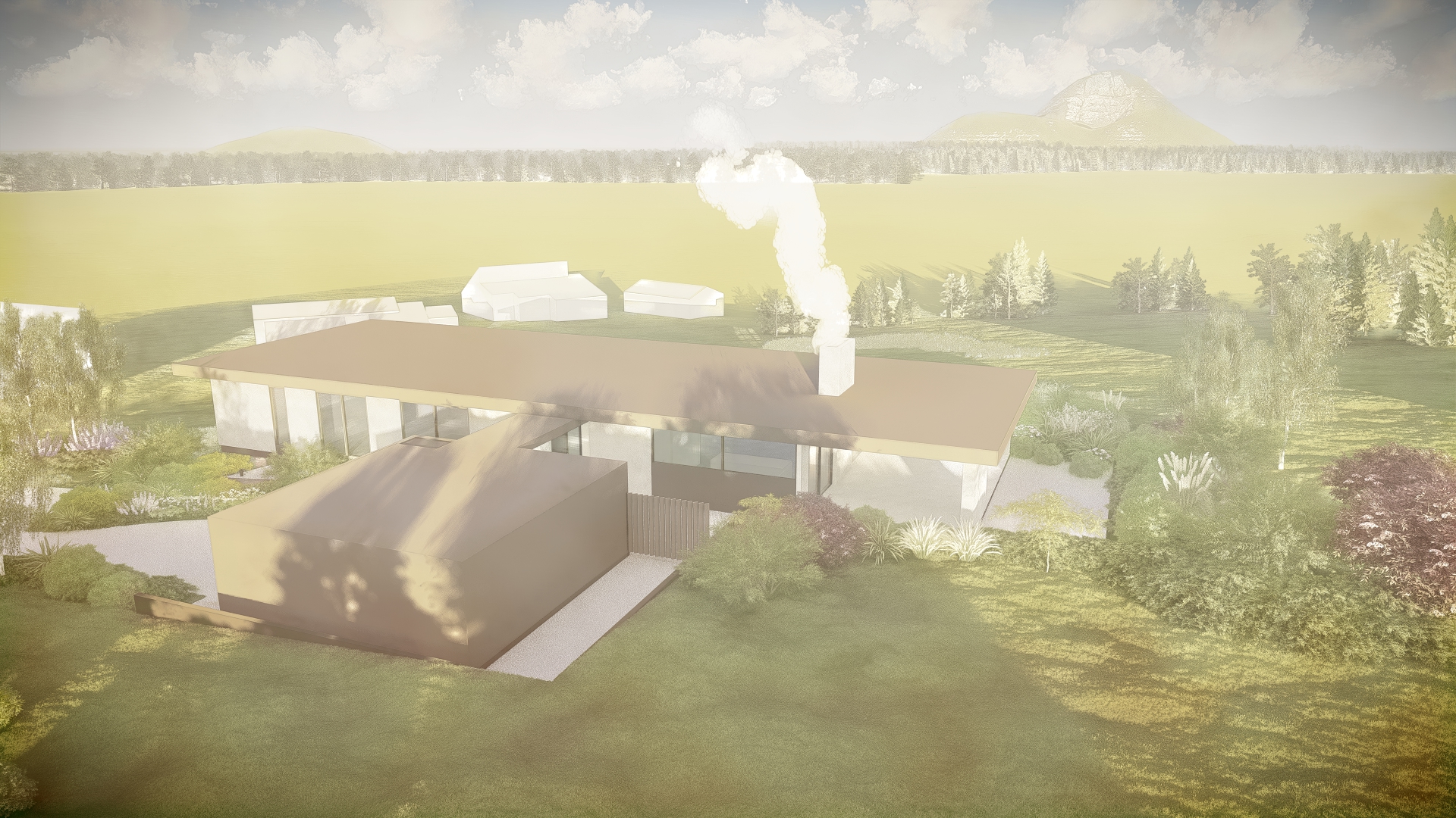 photorealistic architectural rendering of a contemporary australian rural home enhancing an existing lumion base image introduce soft atmospheric depth abundant natural light with a warm low angle sun early morning or late afternoon creating gentle highlights and soft shadows the front of the building needs direct sunlight on an oblique angle refine materiality to feel tactile and true to life metal with subtle reflectivity and imperfections glazing with realistic reflections and slight interior transparency add understated warm interior lighting 2700k 3000k to create a soft glow ensuring it feels natural and not overexposed balance interior and exterior lighting so neither dominates enhance landscaping with slight movement and realism softened edges and subtle tonal variation in grasses and foliage introduce light environmental effects e g faint haze diffused background to increase depth and atmosphere overall mood should be warm calm and evocative slightly ethereal but grounded in realism avoid overly dramatic contrast or stylisation aim for a premium architectural photography aesthetic with a cinematic softness
