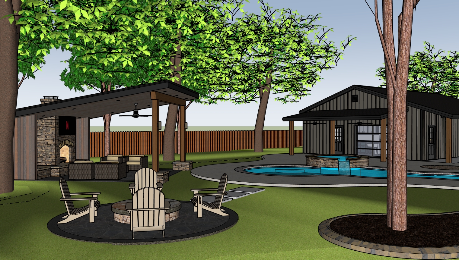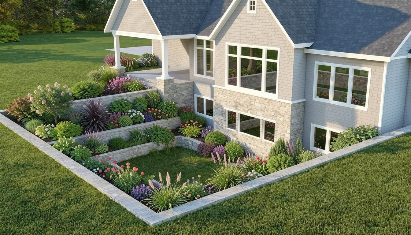 maintain geometry photo realistic with trees in background add shrubs to planting bed lower right add warm accent lighting