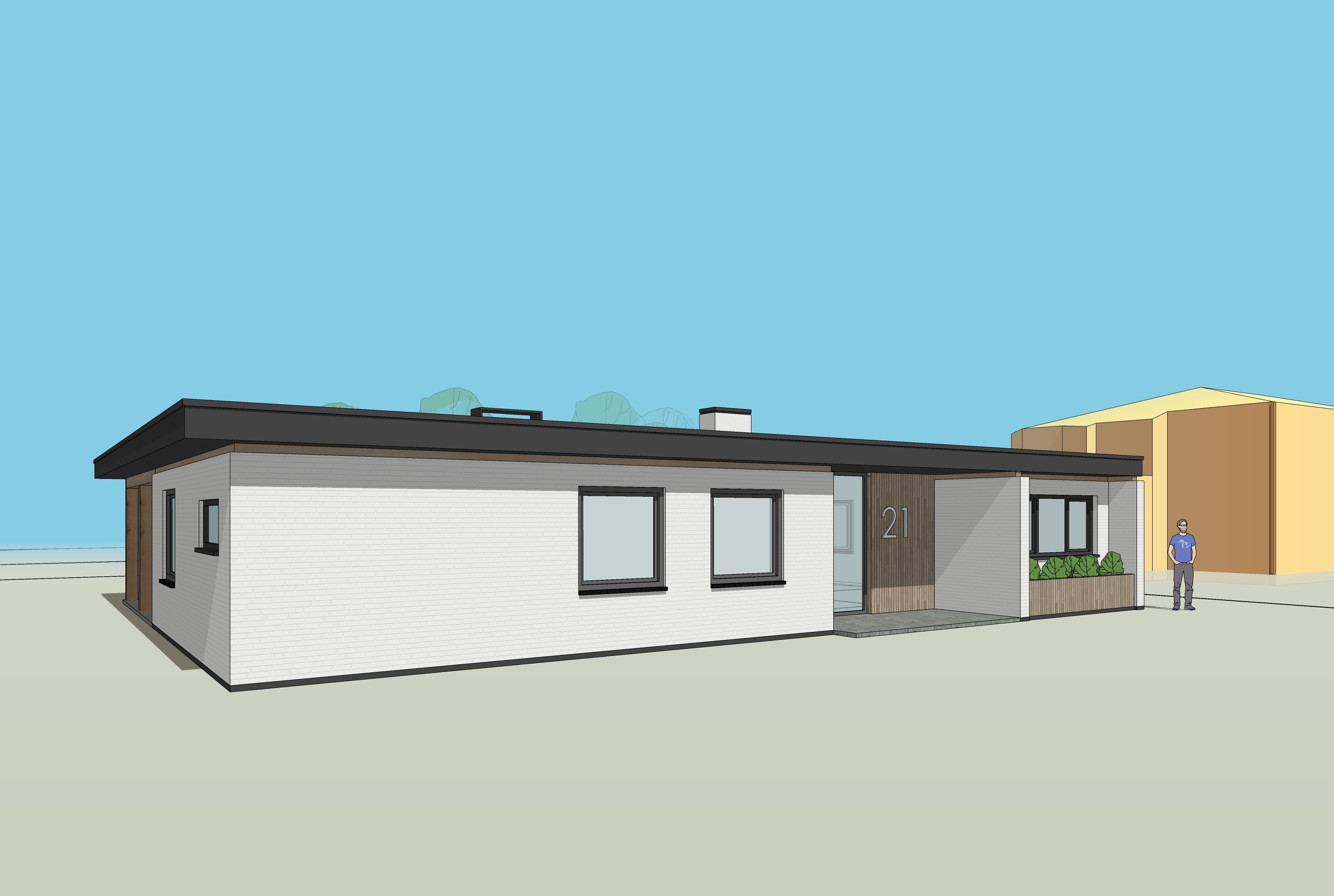make it a sunny day with gras in the front a path to the frontdoor people in the front and lots of trees forest in the background and delete the brown building in the right