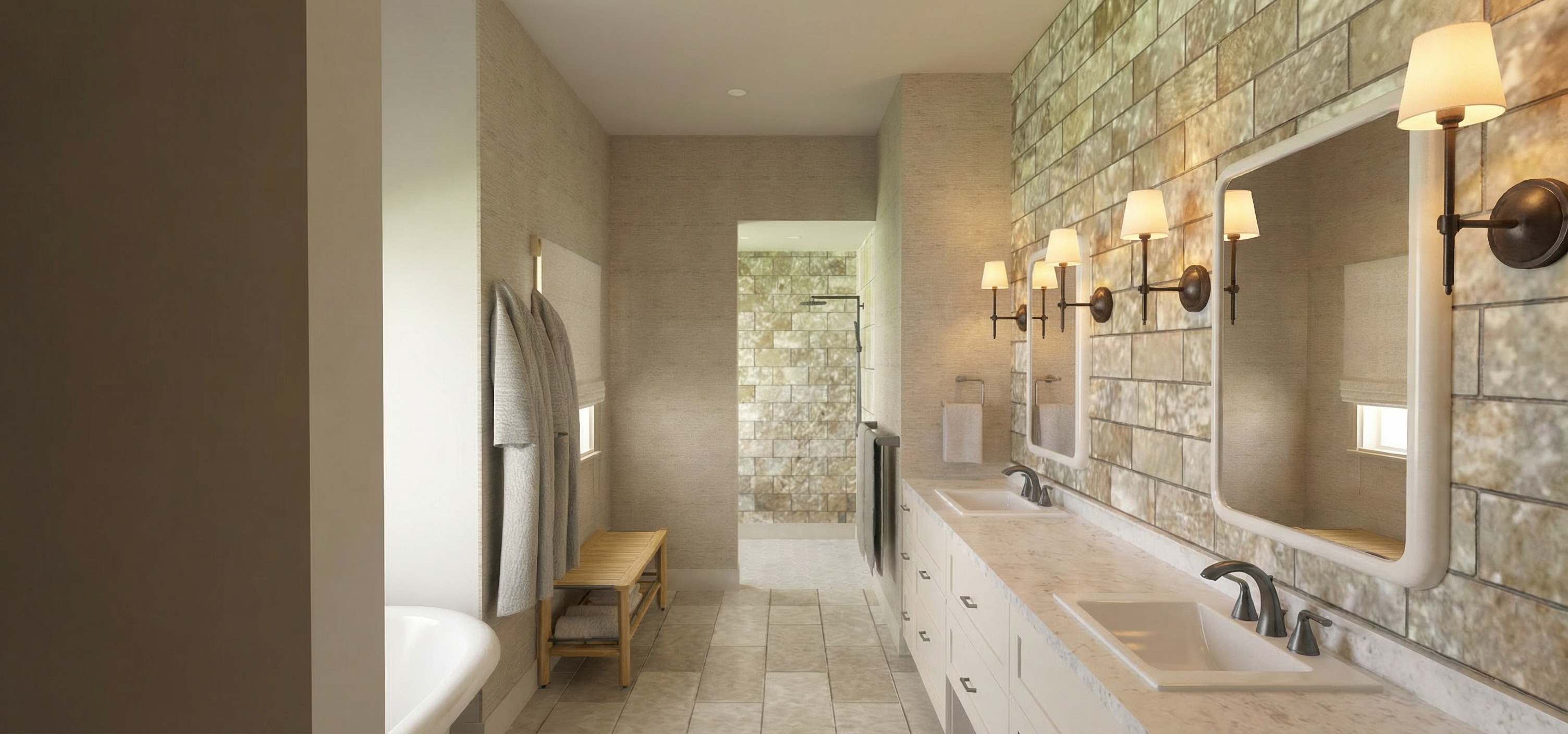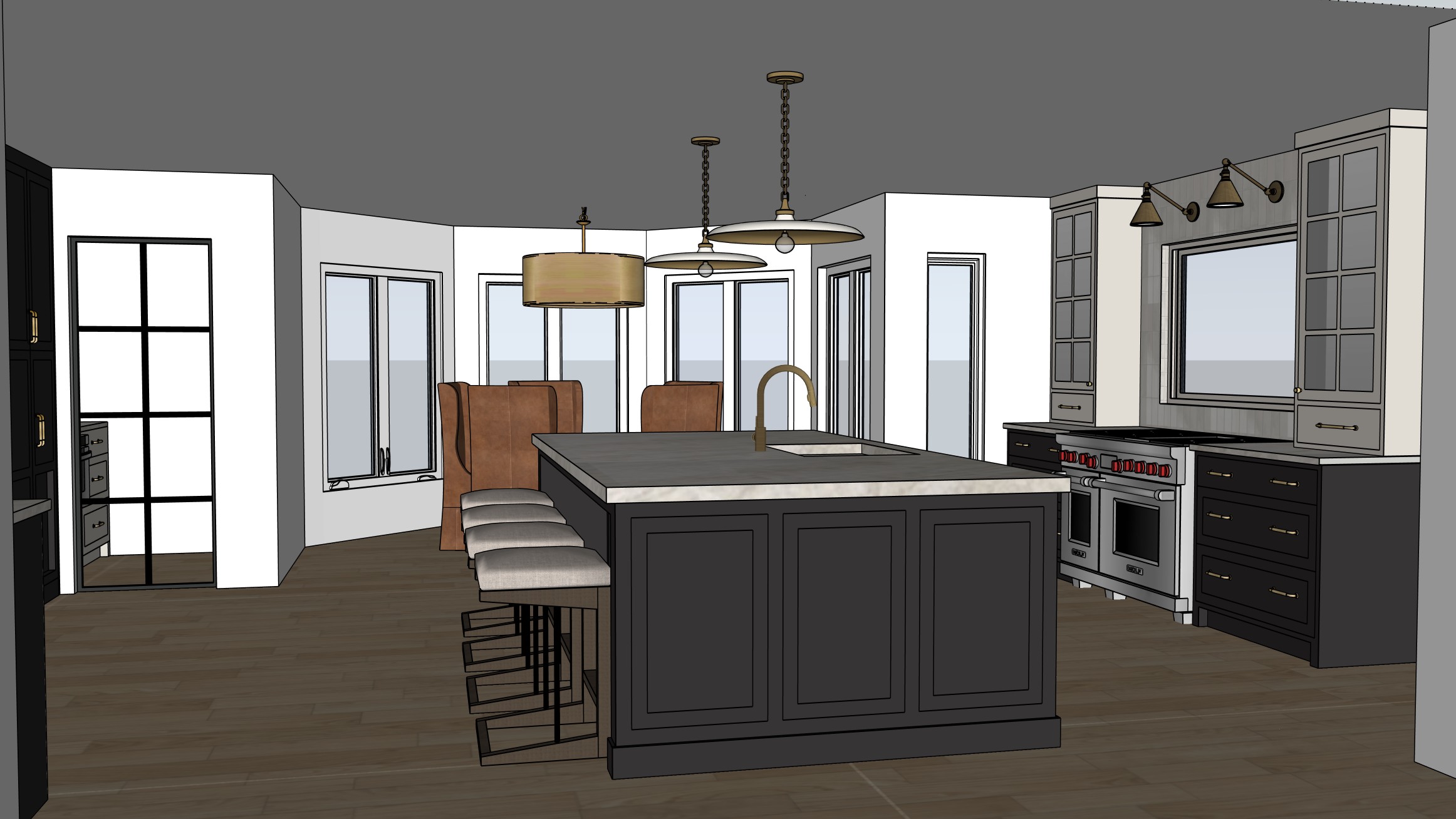 ultra realistic kitchen rendering based on a sketchup model realistic cabinetry materials soft beige hutch cabinets glass doors with interior low voltage lighting crystallo quartzite countertops with subtle veining accurate texture scale white oak floors with subtle wear and color variation matte painted walls with slight texture realistic fabric upholstery with visible weave physically accurate reflections and shadows soft warm natural lighting global illumination professional interior photography crisp edges high detail clean modern aesthetic full frame camera 28mm lens