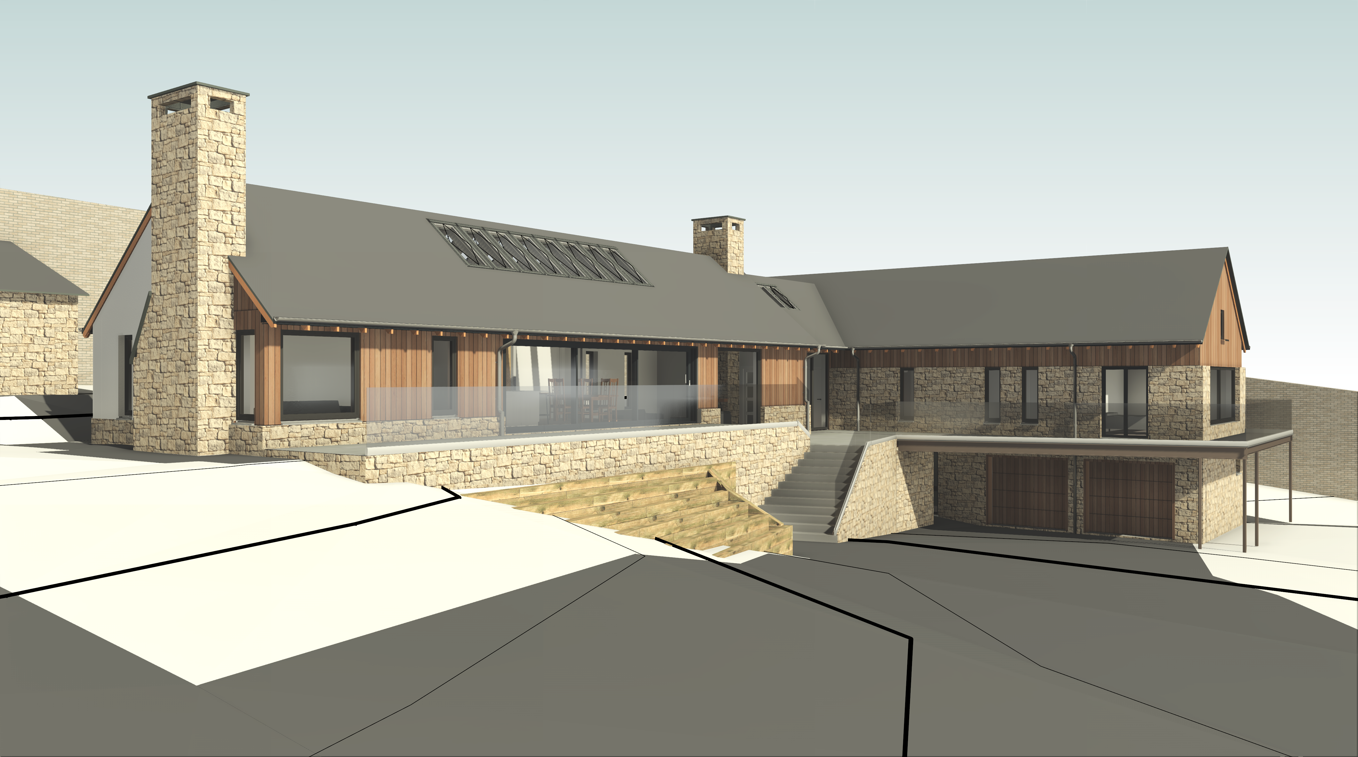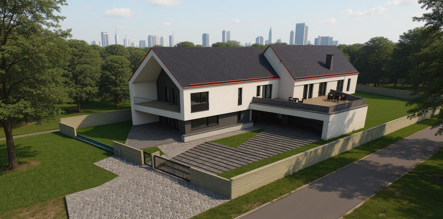 add weather as sunny with few clouds trees and grass to white ground make grey driveway paving make cream brick a buff cream stone timber sleepers to go sloping up hill as shown