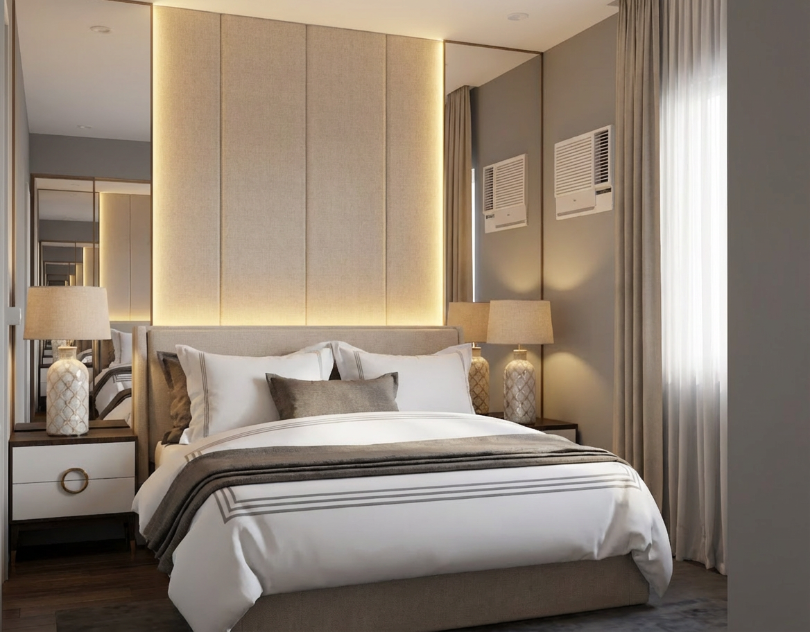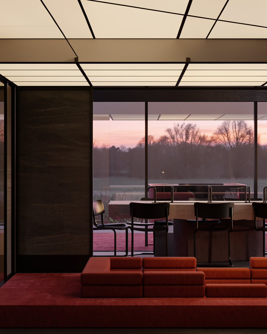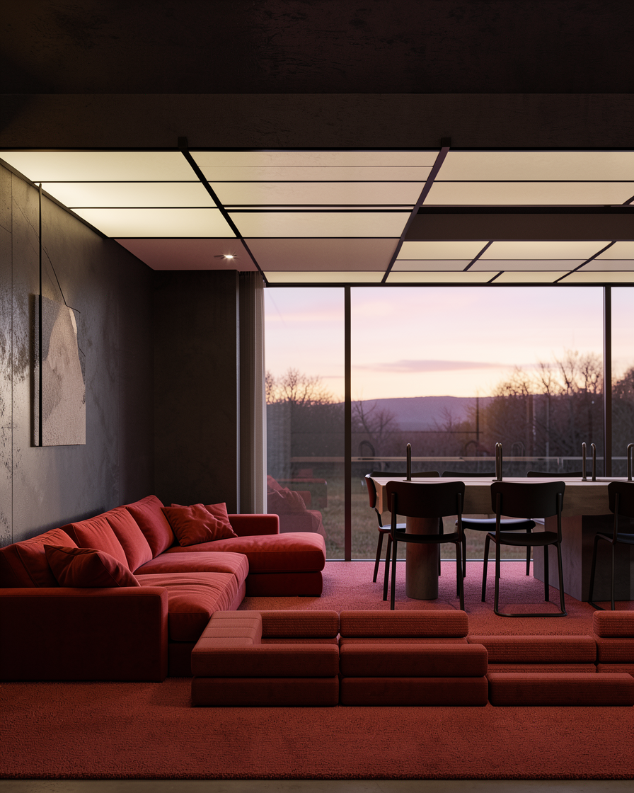 a modern minimalist living room centered around a sunk seating area with comfortable red cushions and a black tv bright screen the soft ambient lighting from the gridded ceiling creates a warm inviting atmosphere a concrete painted panelled wall in the background the sleek dark brown walls and red carpet flooring provide a sophisticated contrast