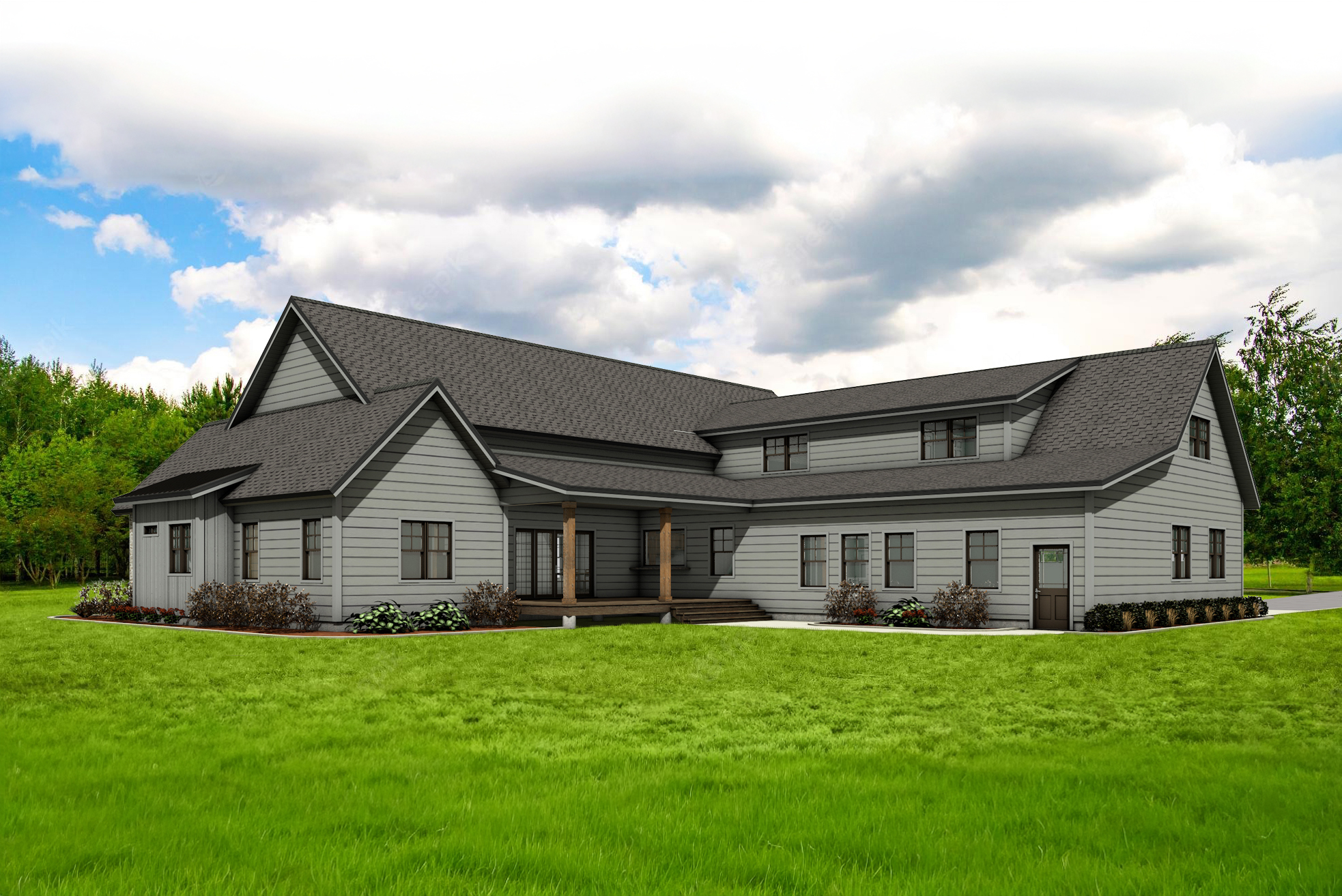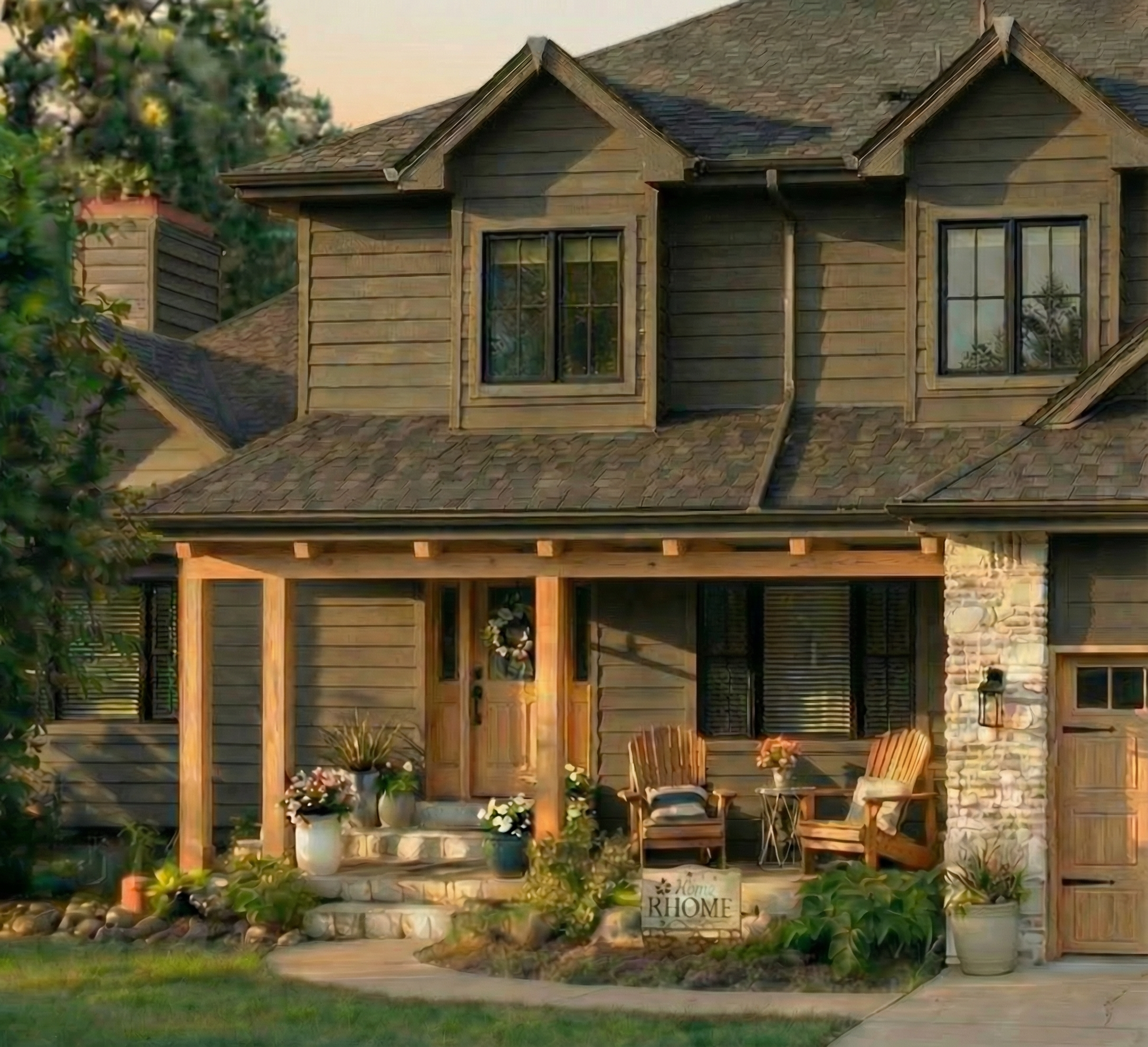a modern house retain the exact structure colors and window arrangement rooflines siding foundation height and proportions exactly as shown in the reference image integrate into the terrain there are just a few trees mixed hardwoods that are mostly on the sides of the image add cooler afternoon sunlight subtle dappled highlights across the siding and grass create ultra realistic lighting crisp shadows detailed textures in the siding and glass reflections and an overcast sky show only a few lights visible inside render in hyper realistic architectural visualization quality 8k resolution add a driveway tying into the concrete garage door apron make it the fall season add realistic landscape