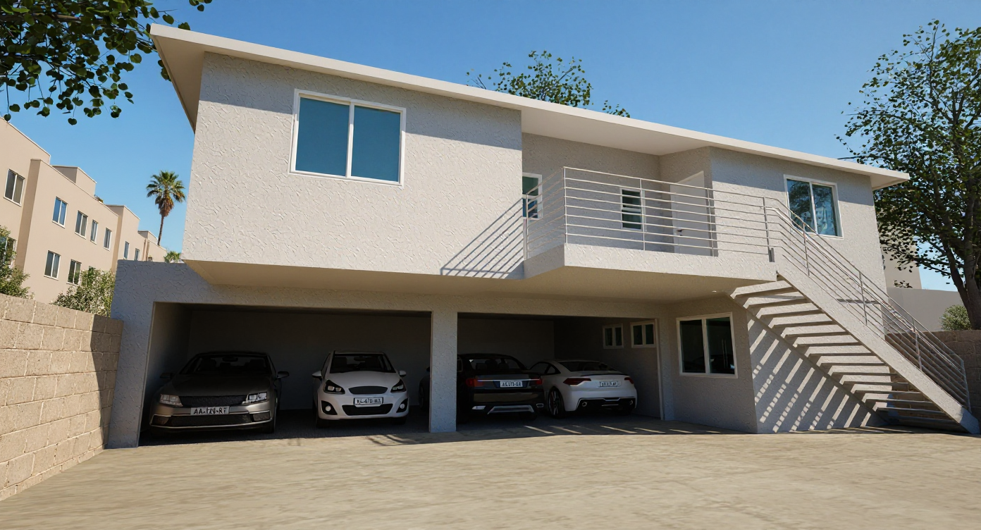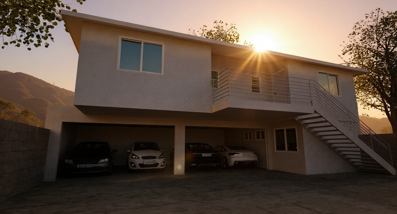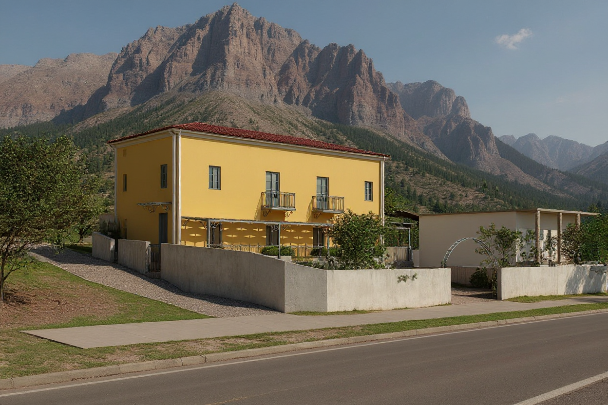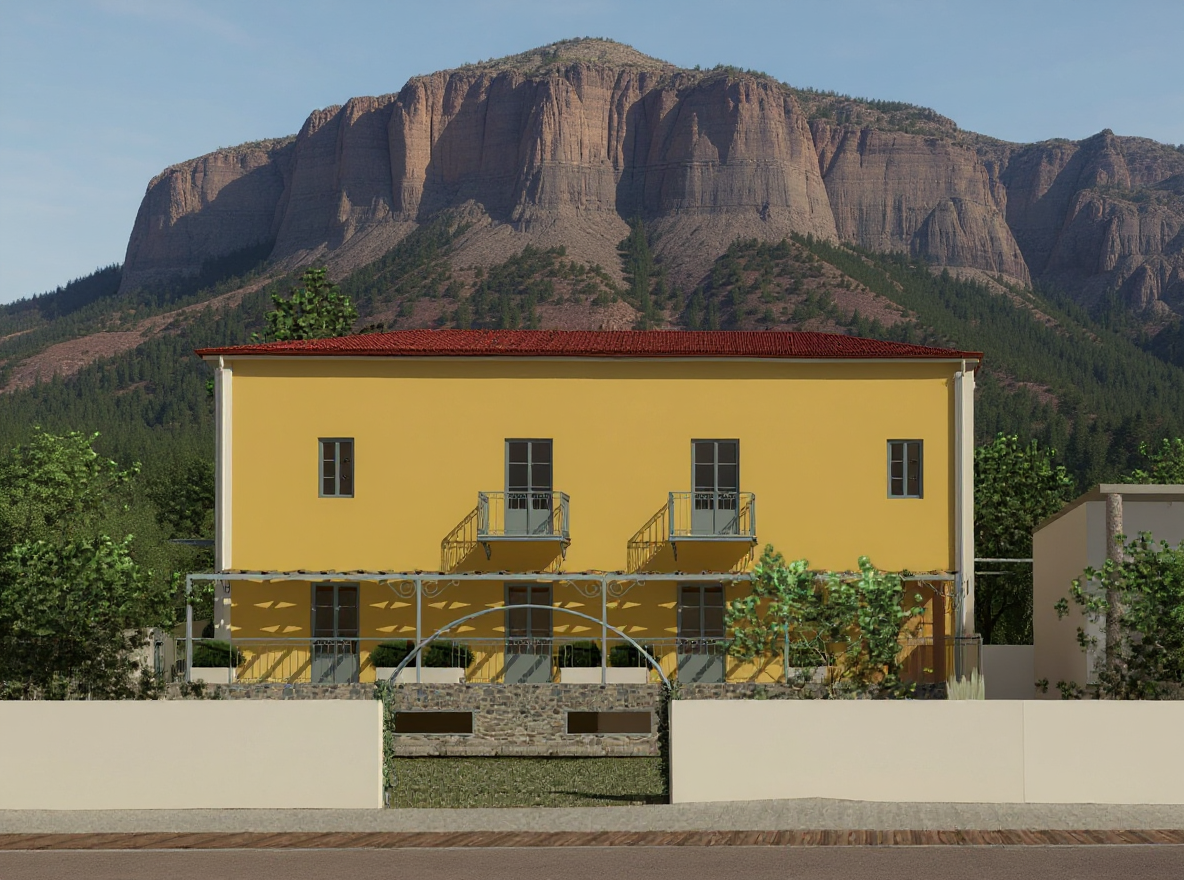 keep existing colors and architectural details show home at twilight with fir trees in the background distance