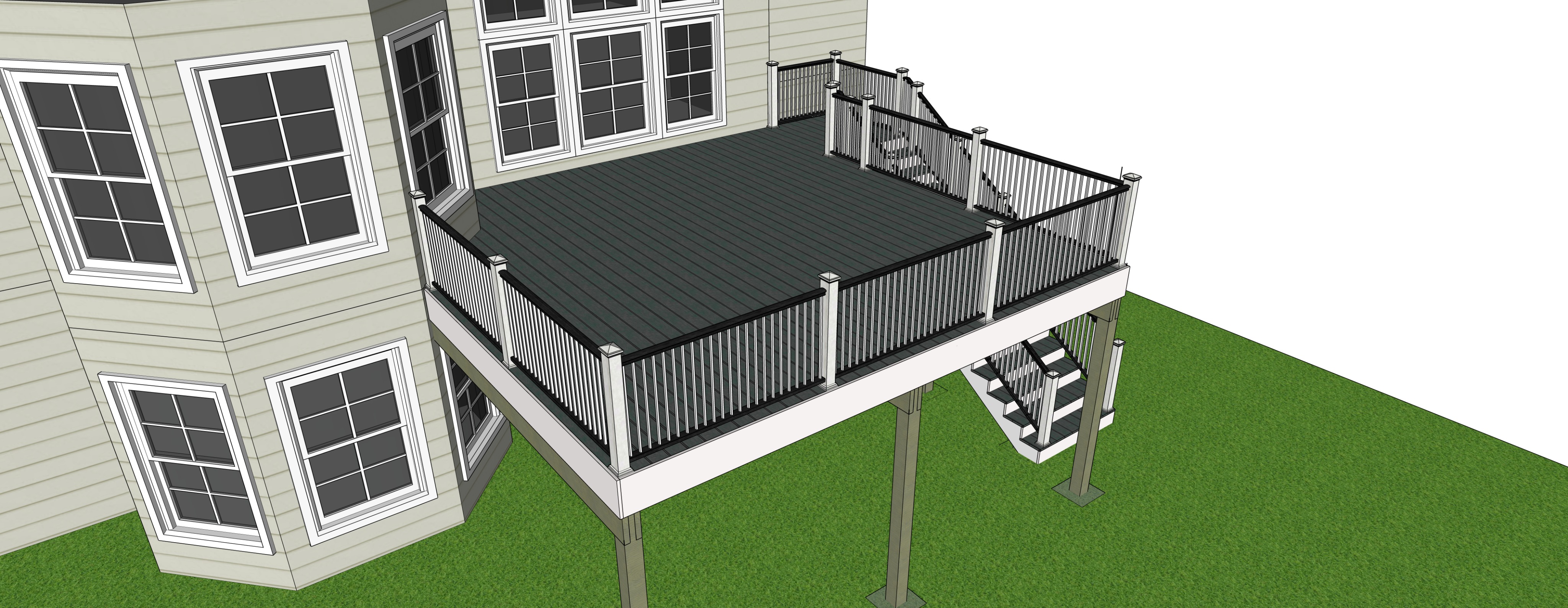 render and finish this shot add a dining table grill and people enjoying the deck keep grass on the ground level and an out door living set and a webber grill on the main deck area no furniture below deck no fence in backgroung