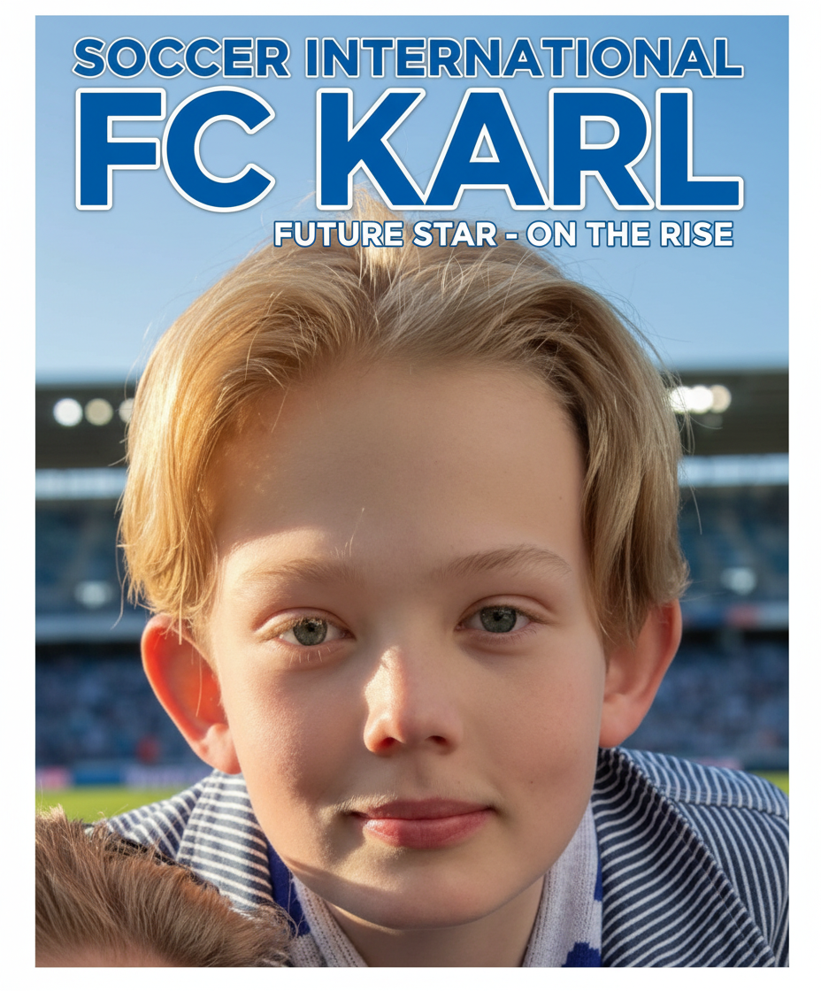 fc karl fade face into stadium background soccer international magazine cover in blue and white sunny style