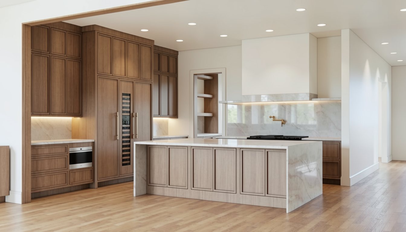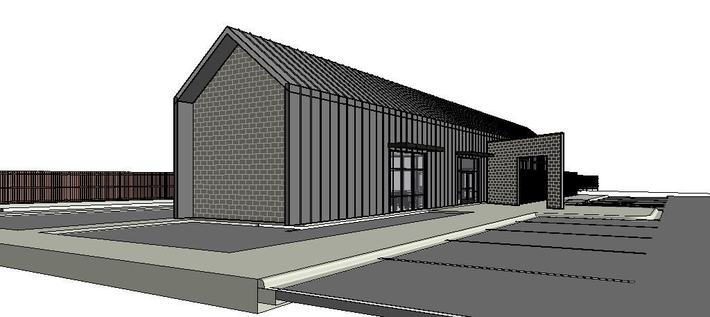 mid day exterior shot in midland texas with minimal sky coverage dark metal standing seam metal roof and wall panels to match roof end wall to have wide cedar wood planks dark bronze aluminum cantilevered awnings asphalt parking lot and southwest planting for landscape